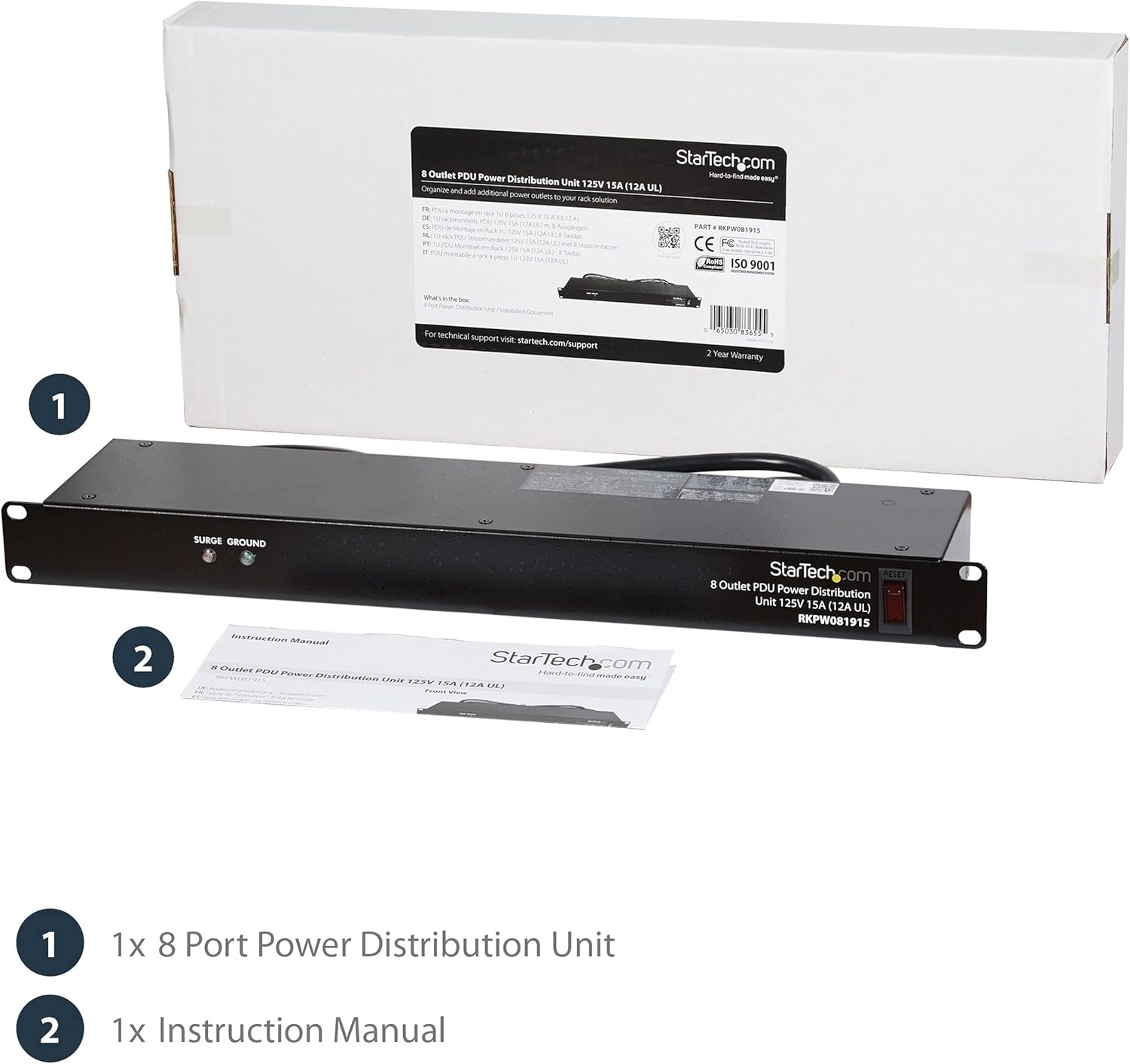 StarTech.com 8 Outlet Horizontal 1U Rack Mount PDU Power Strip for Network Server Racks - Surge Protection - 120V/15A - w/ 6ft Power Cord (RKPW081915)