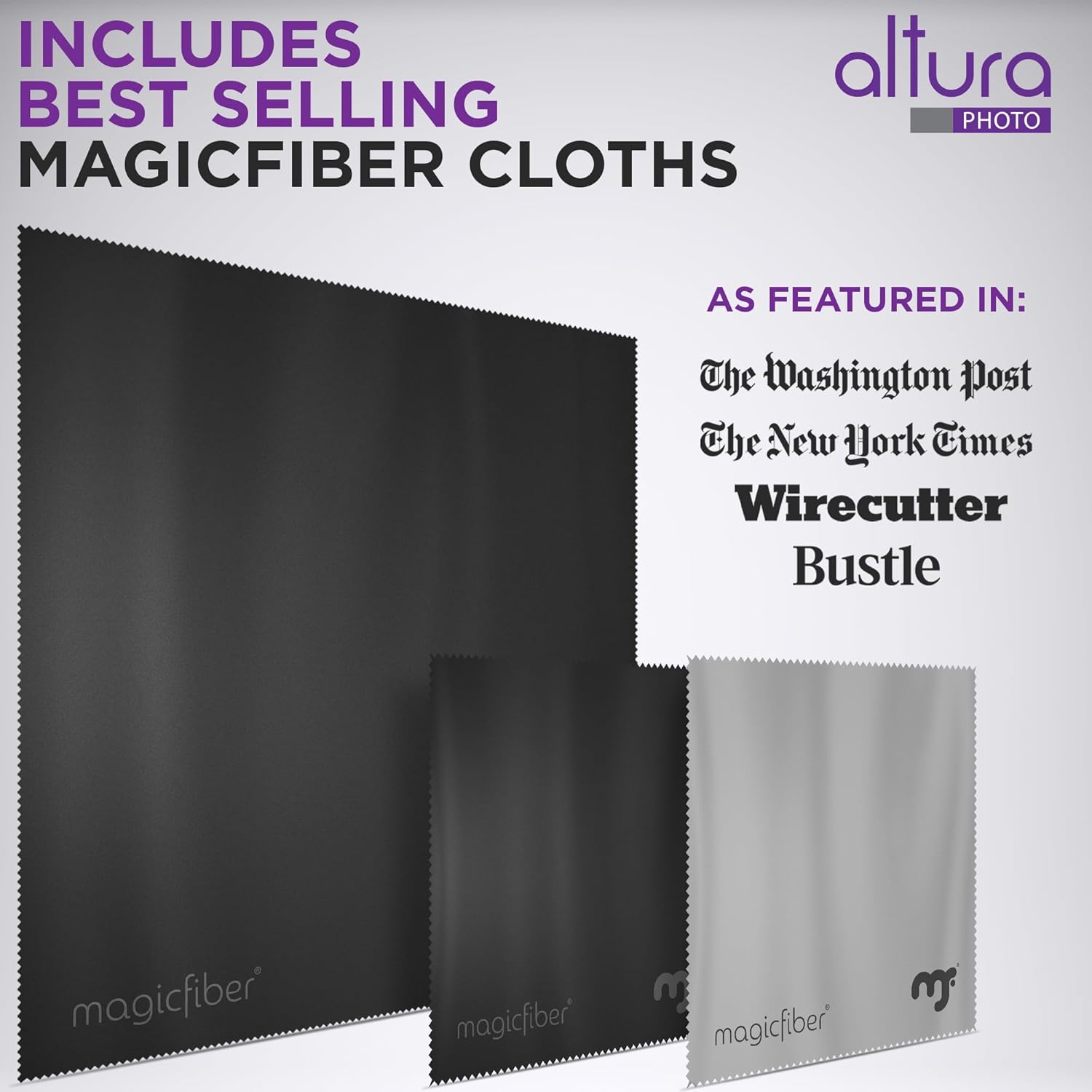 - Kit includes: Altura Photo Lens Cleaner 2 oz. Bottle + Altura Photo Lens Cleaning Pen + Altura Photo Lens Brush + Altura Photo Air Blower Cleaner + Altura Photo 50 Sheets Lens Cleaning Tissue Paper + 3 Pack Extra-large Oversize and Original Premium MagicFiber Microfibers Cleaning Cloths