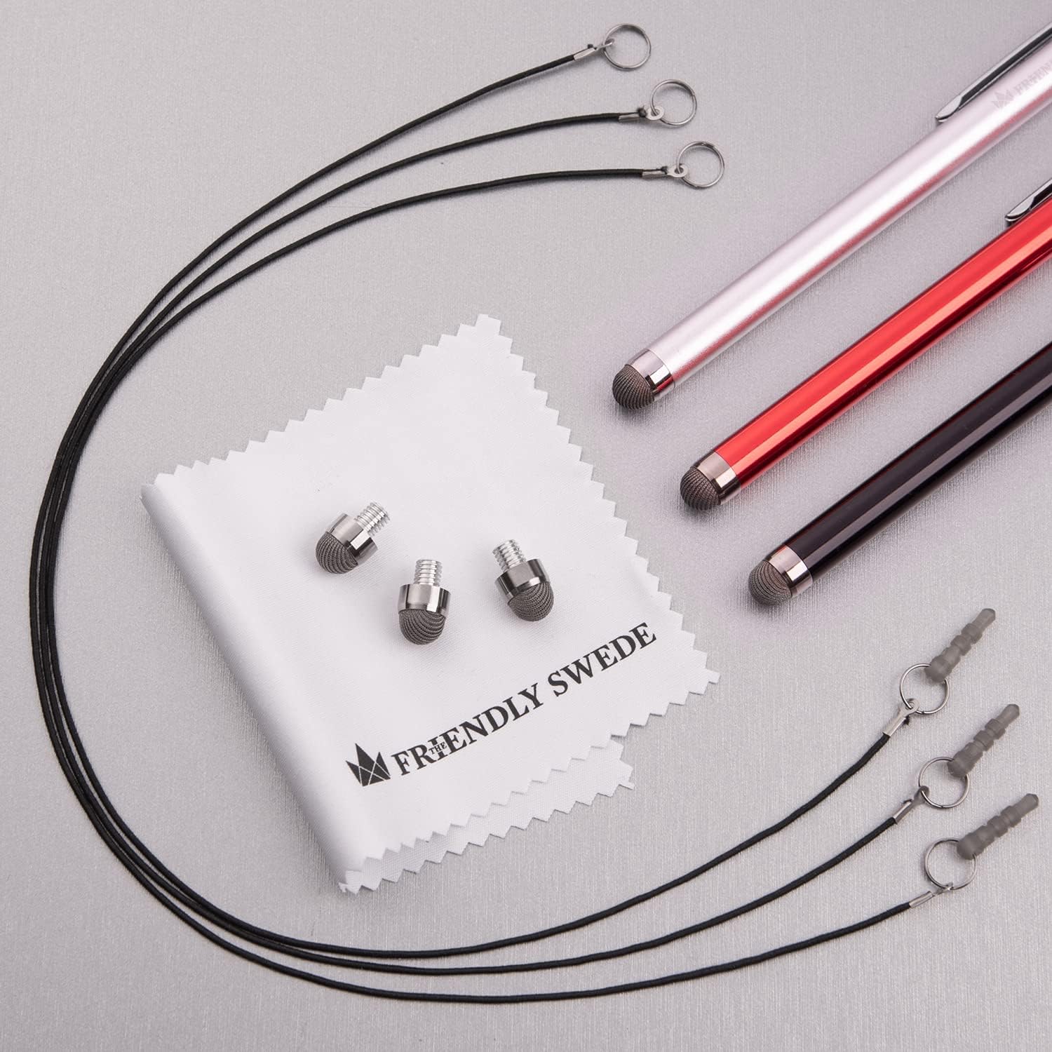 The Friendly Swede Mesh Tip Stylus Pen for Touchscreen — 3-Pack Micro-Knit Capacitive Stylus Pen for iPad & iPhone with 3 Replaceable Fiber Tips, Elastic Lanyards & Screen Cleaning Cloth