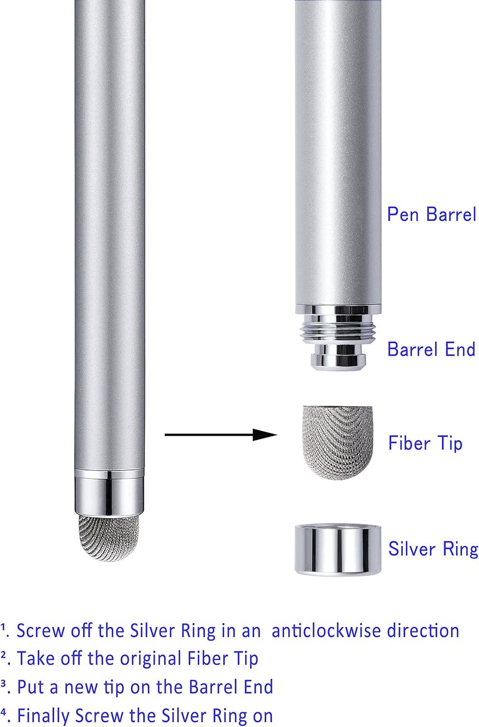 Stylus, 4 Pcs 5.0 Inch Mesh Fiber Tip Stylus Pens for Touch Screen, Compatible with iPad, iPhone, Kindle Fire, 4 Extra Replaceable Hybrid Fiber Tips (White, Black, Silver, Blue)