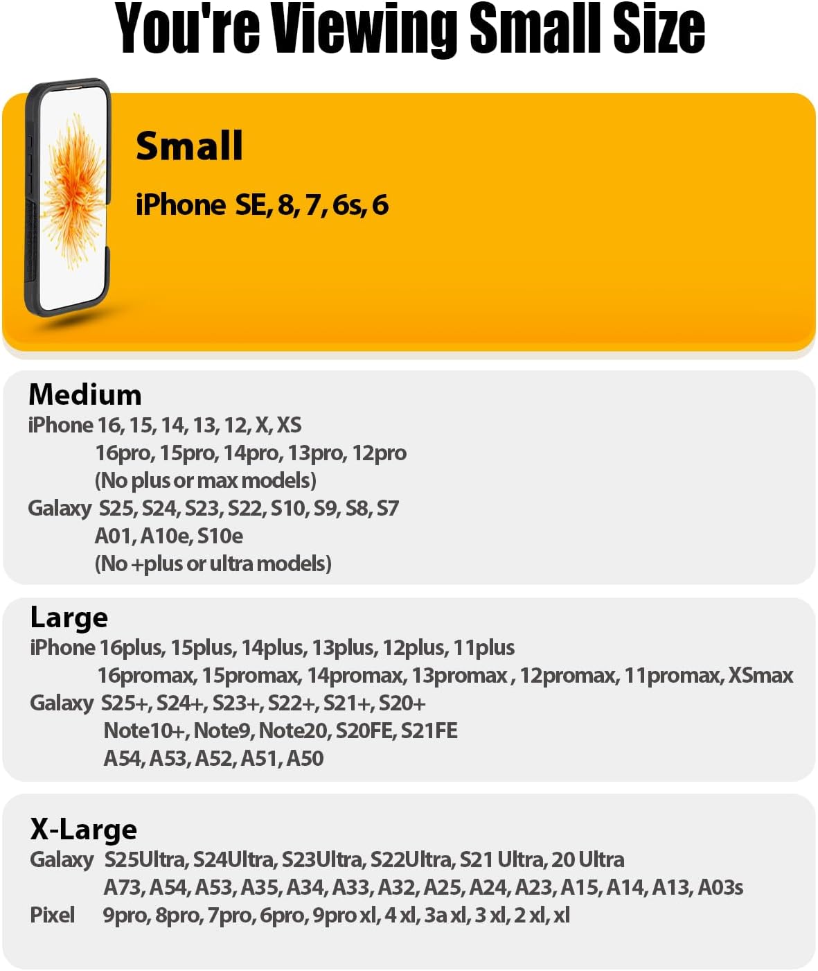 - Small Size holster deisnged for iPhone SE, 8, 7, 6s, 6 phone models with protective cases on.