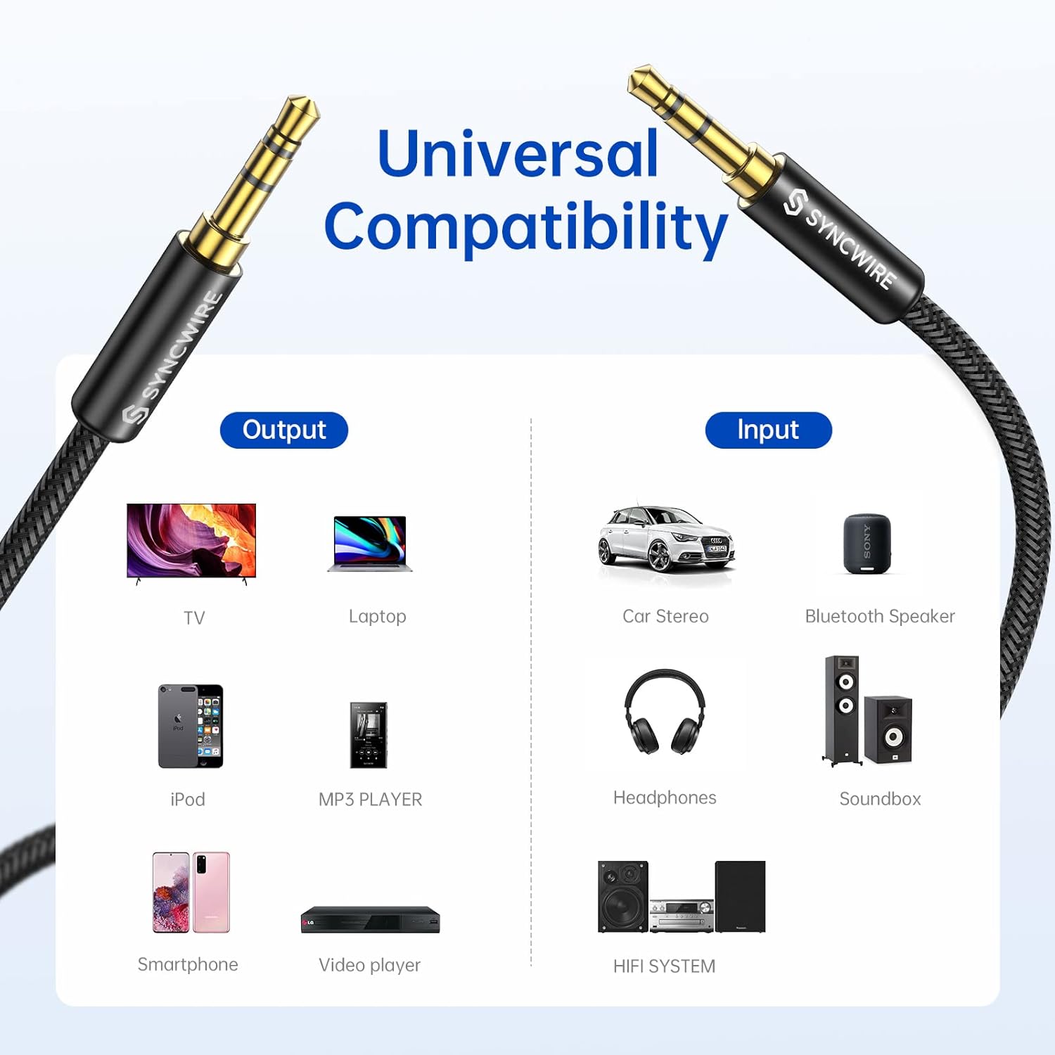 - Universal Compatibility: Perfectly compatible with any devices with a 3. 5mm aux port. Such as Apple iPhone, iPod, iPad, Headphones, Hi-Fi, Car Stereos, Tablet, Laptop, Smartphones, MP3 Player, Speaker and any other audio-playing devices. (ATTENTION: Incompatible with Life proof Cases And Otter Box cases)