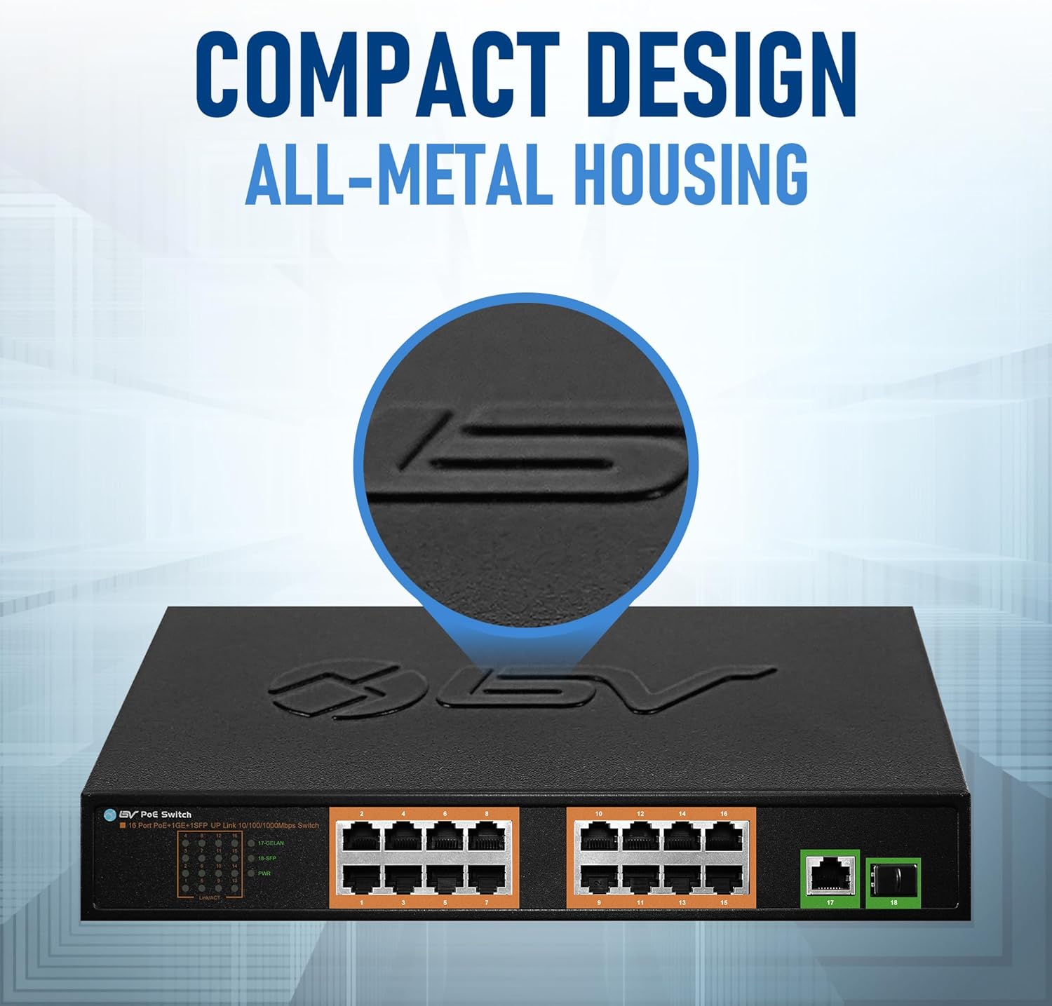 BV-Tech 18 Ports Long Range PoE+ Switch (16 PoE+ Ports | 1 Gigabit Ethernet uplink with 1 SFP Uplink) - 19" Rackmount - 120W - 802.3af/at -Desktop Design for Easy Set Up (16 Gigabit PoE+ Ports | 120W)