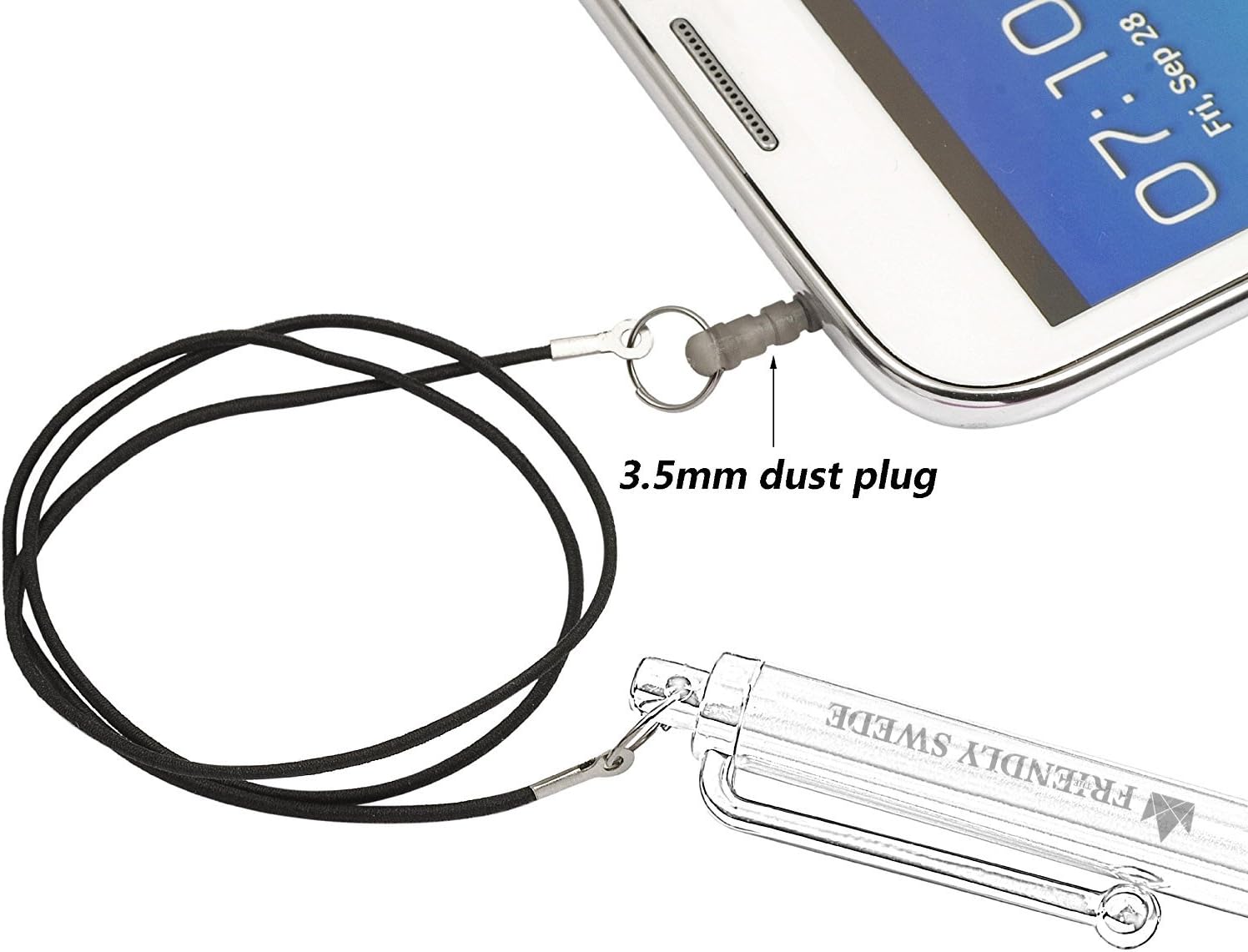- 6 x 15 inch elastic detachable stylus lanyards and The Friendly Swede microfiber cleaning cloth 5.5x3.0" included