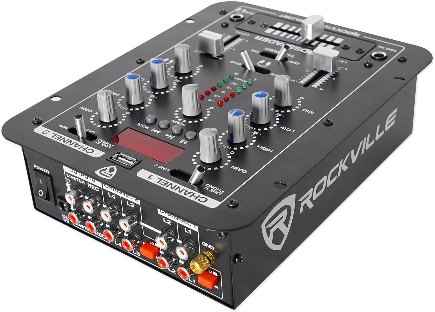 - Rockville RDJ3BT compact 2 channel DJ mixer with USB, Bluetooth, and LED display.
