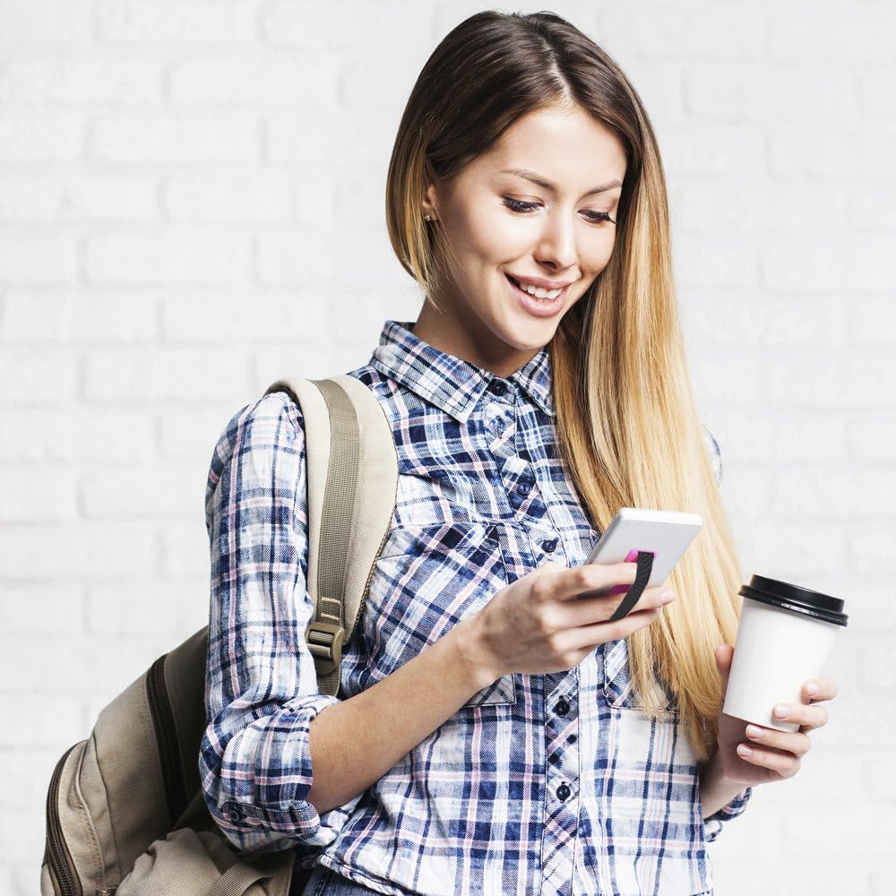 - NEVER DROP YOUR PHONE AGAIN. Convenient and comfortable elastic finger strap allows you to securely hold and operate your mobile phone or device without the fear of dropping it, even when you only have one hand free. Perfect for selfies, one-handed texting, answering and making phone calls, emails, taking photos or just checking social media accounts.