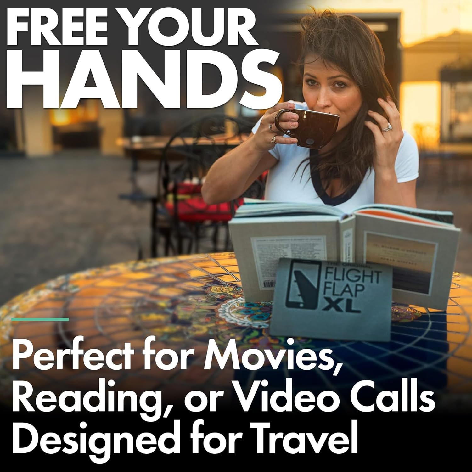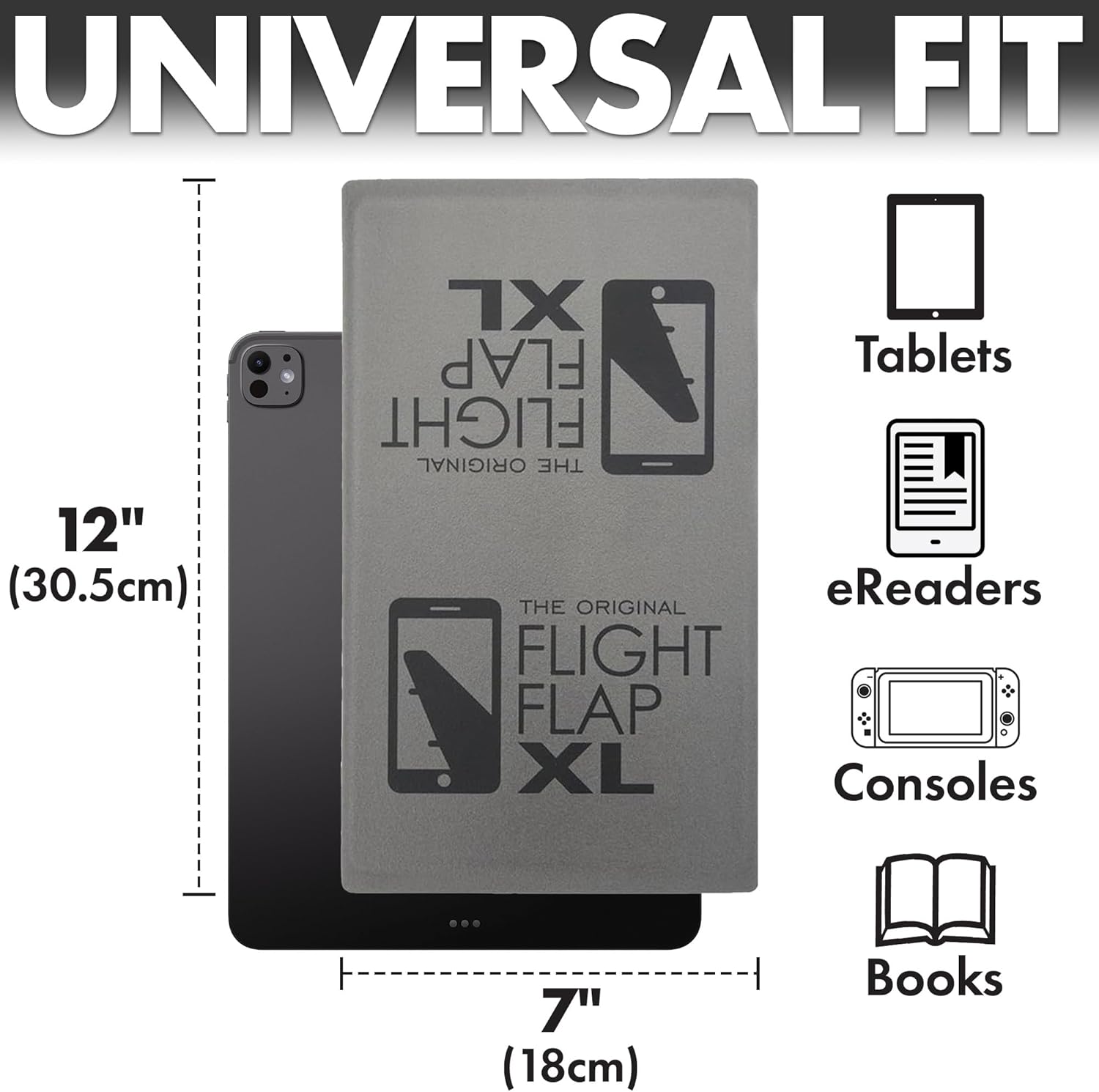 - FOR PHONES, TABLETS, BOOKS – The FLIGHT FLAP XL's travel tablet stand and kindle holder accommodates a wide range of phones (iPhone, Android), small tablets and e-readers (iPad, MS Surface, Google Pixel, Amazon Fire, Kindle) handheld gaming consoles (Nintendo Switch) or your favorite books.