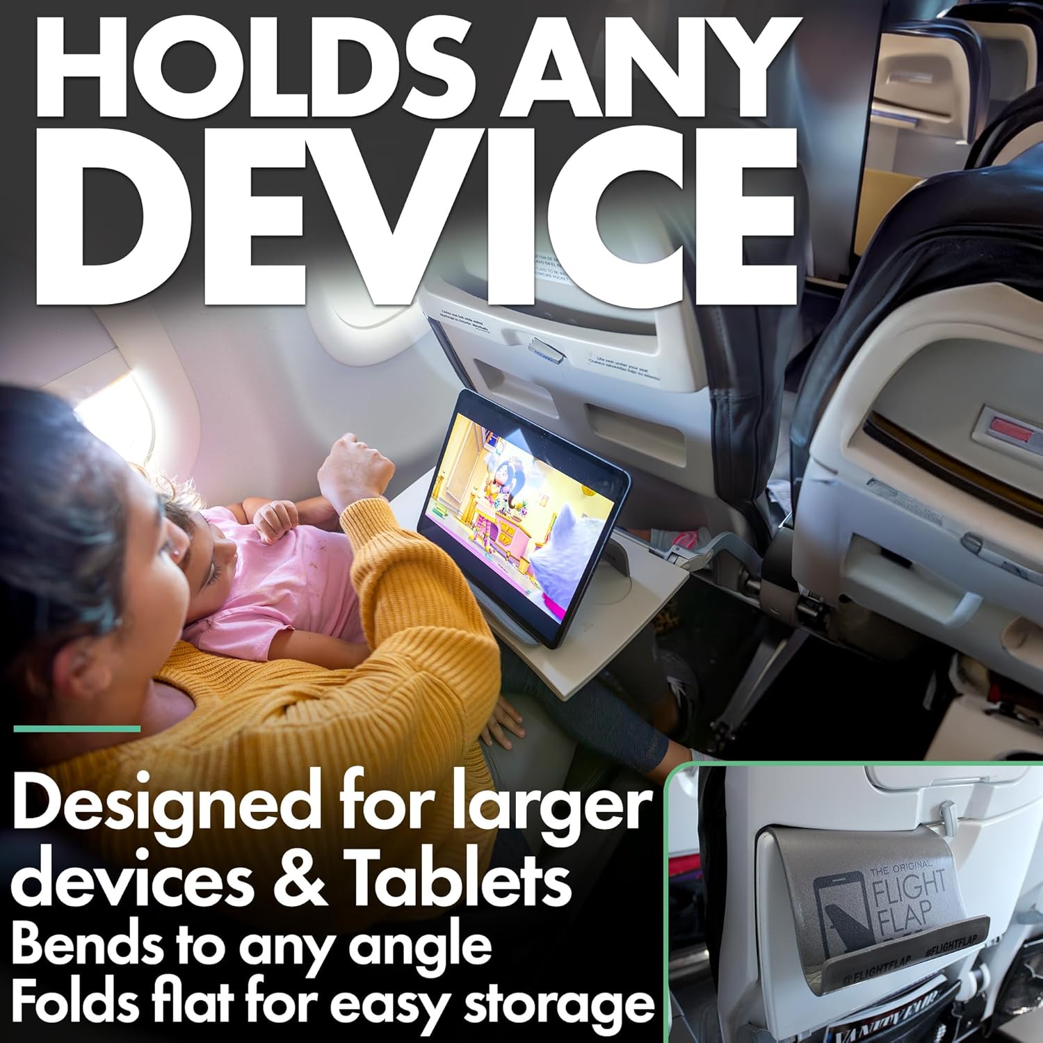 - USE FOR TRAVEL, WORK & LEISURE – Great for watching movies, entertaining kids, streaming workouts, hosting a zoom video call, or cooking with recipes on your phone. Use the FLIGHT FLAP XL's tablet stand desk anywhere to grip your device and view your content comfortably. Attaches to most airline seat backs and tray tables. During car rides, attach behind the headrest and stream movies for kids. Properly positions your phone or tablet to host zoom meetings.