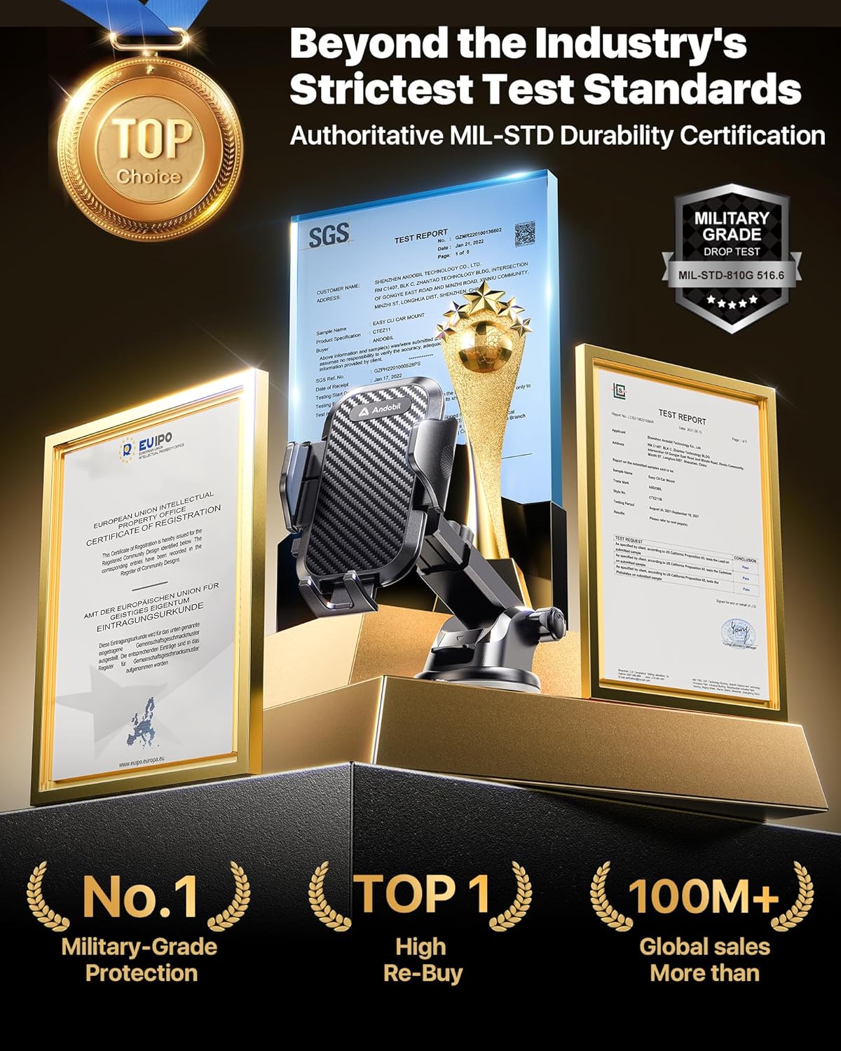 - 【Industry NO.1 Military-Grade Stability】Authorized by the international Military Standard with 50+ rigorous engineering tests of 85 lbs suction, 44°F --195°F temperature test, 10,000+ Opening and Closing tests, etc., its stability, security and durability perform NO.1 among all holder. By especially breaking the industry's record obtained international military-grade shockproof certification No. GZMR220601855501, Hold your phone firmly on any rough roads.