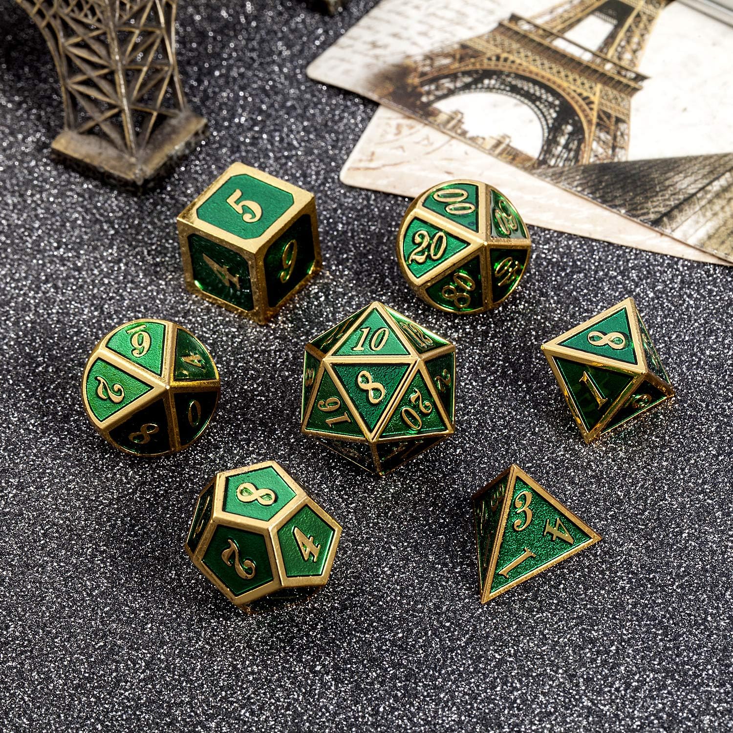 Metal Dice Set D&D, DNDND 7 Die Green DND Dice with Metal Case for Dungeons and Dragons Role Playing Game and Tabletop Games (Gold Number with Enamel Green)