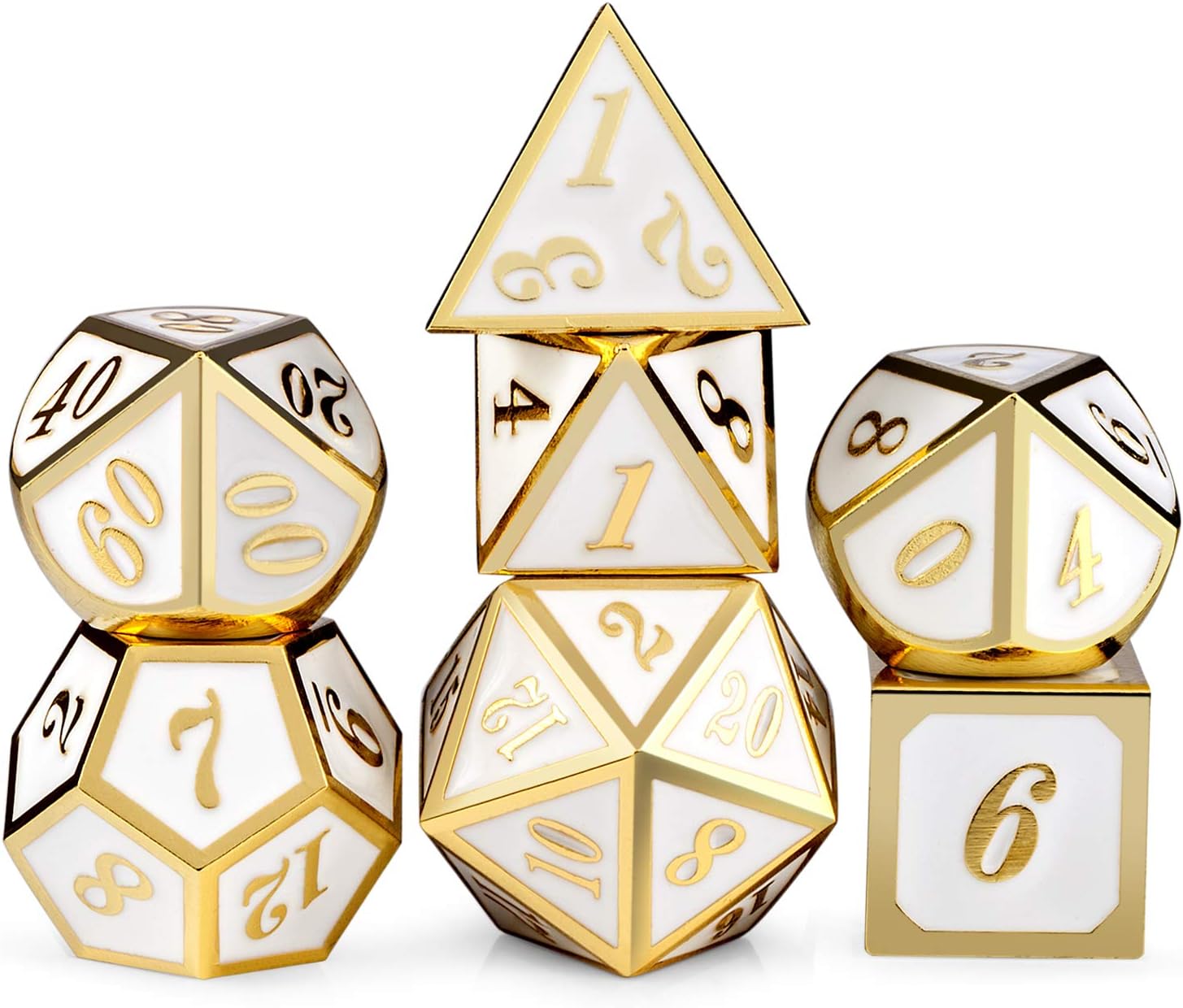 DnDnD White with Gold Number DND Dice Sets,Solid Metal Die with Free Gorgeous Metal Tin for Dungeons and Dragons D&D Role Playing Game Tabletop Games