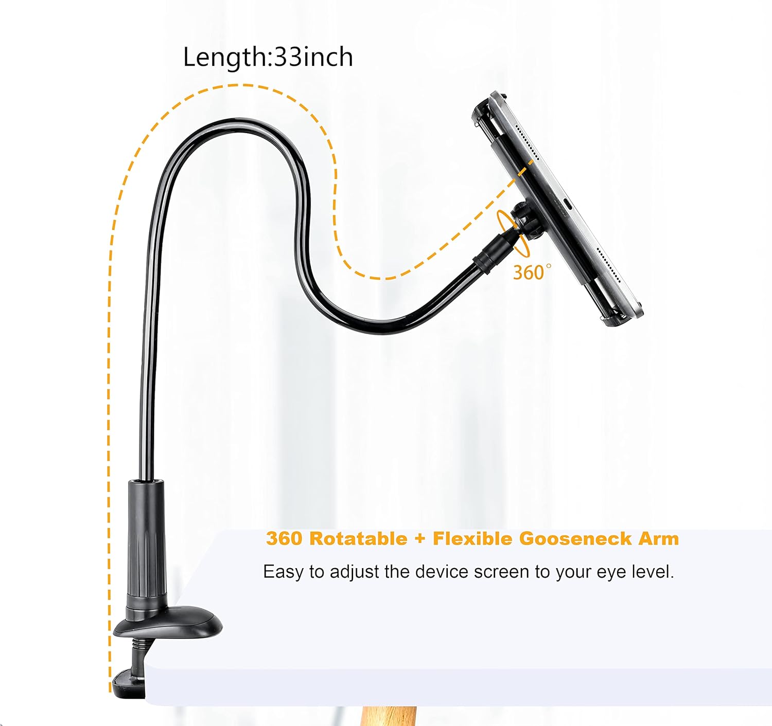 - ăEasy AdjustmentăThe Phone holder for bed features 33inch flexible arm and a 360-degree ball swivel joint design, allowing you to quickly adjust to any horizontal or vertical angle. With the lazy ipad holder stand, It raises your phone/ipad /ereader kindle to eye level, relieving neck and arm pain.
