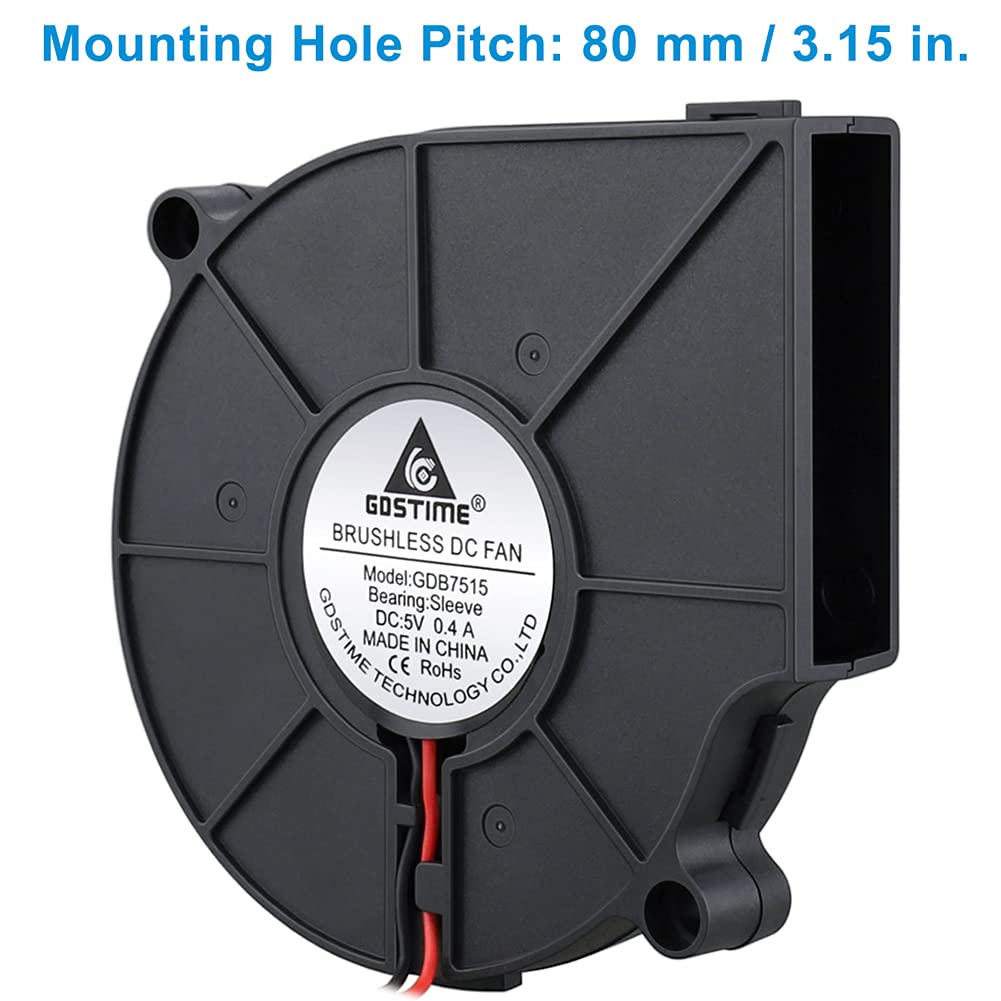 - EASY TO INSTALL: Blower Size: 75x75x15 mm(2.95x2.95x0.59 in.); Air Intake: 50.6 mm/2 in.; Air Outlet: 45.5x15 mm(1.79x0.59 in.); Mounting Hole Pitch: 80 mm/3.15 in.