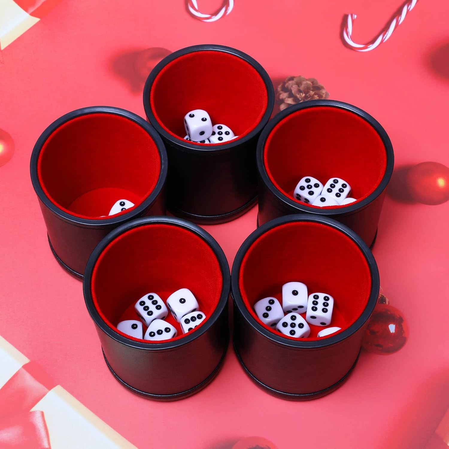 Leatherette Dice Cup Set Red Felt Lined Shaker with 6 Dot Dices for Yahtzee Farkle Bar Party Dice Games-5 Pack