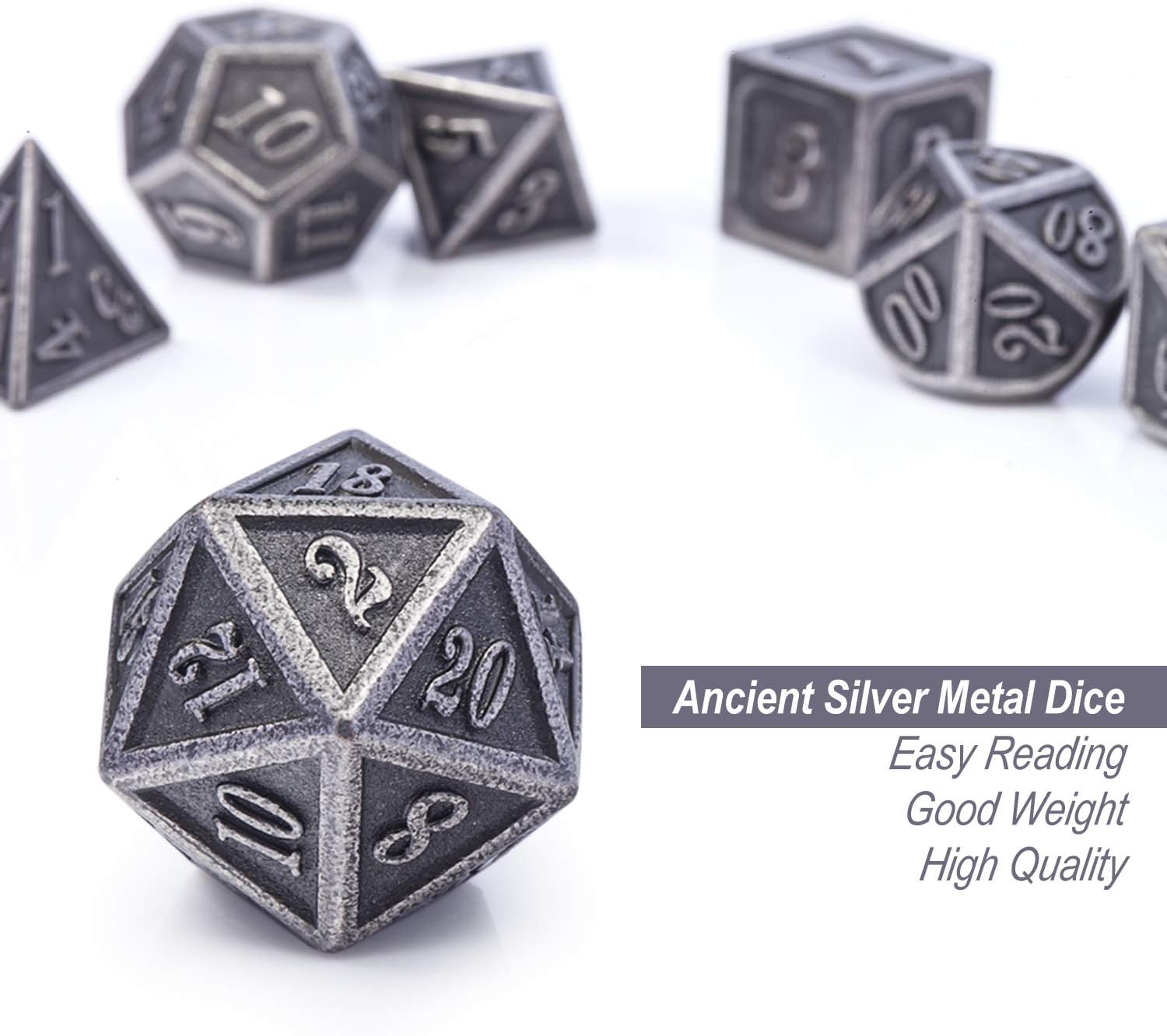 DnDnD Acient Silver Metal DND Dice Set, 7PCS D&D Metal Dice with Metal Case for Dungeons and Dragons, Shadowrun, Pathfinder, Savage World and Table Games