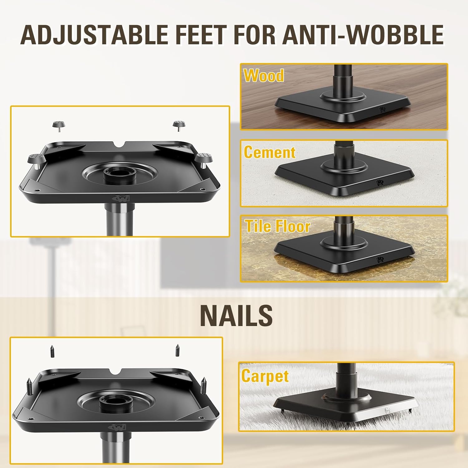 - STABILITY & SAFETY - 9.8" x 9.8" wide base ensure your speaker to stand in a way more stable and balanced. Come with adjustable adjustable feet and carpet nails for different floor type such as wood, cement, tile floor and carpet. Adjust the feet to level the base for better stability