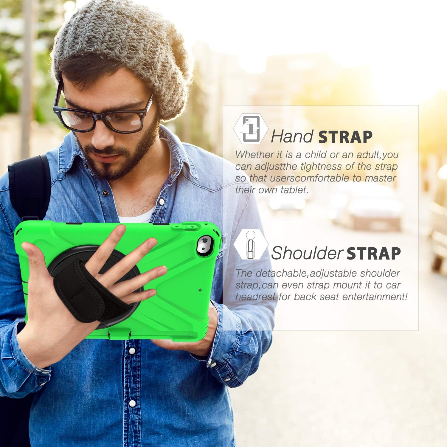 - Adjustable shoulder strap: By attaching strap to any two corners and adjusting to a comfortable length, ipad cover tablet can be carried in a landscape/portrait modes more securely during hiking, traveling or other outdoor activities. Also, strap allows to hang up your tablet behind car seat for entertainment for kids.