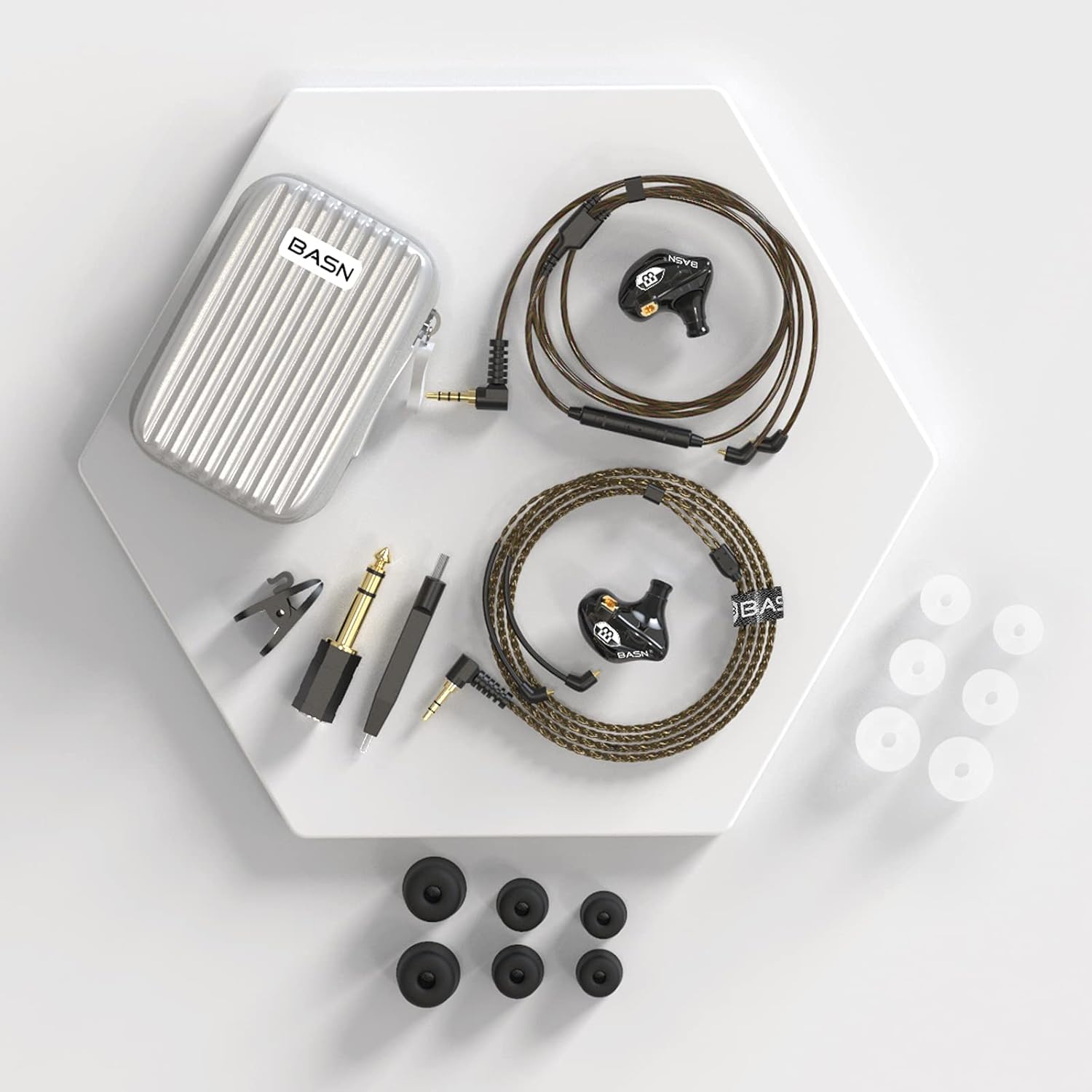 - 【Complete Kit Fits】This BASN Bsinger Pro iem headset comes in a quite neat packaging. The box contains a pair of in-ear monitors, 2 different types of cables, a hard flexible carrying box, several sets of earbuds and memory eartips, a headphones airline 1/4″adapter, a cable clip, and a cleaning tool