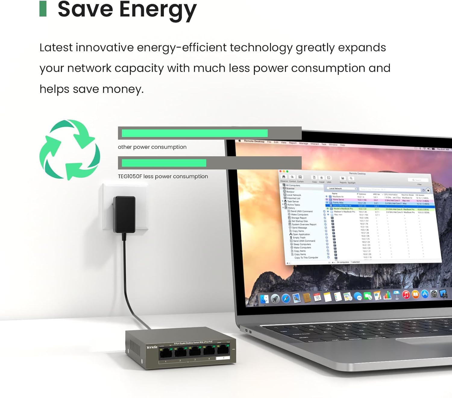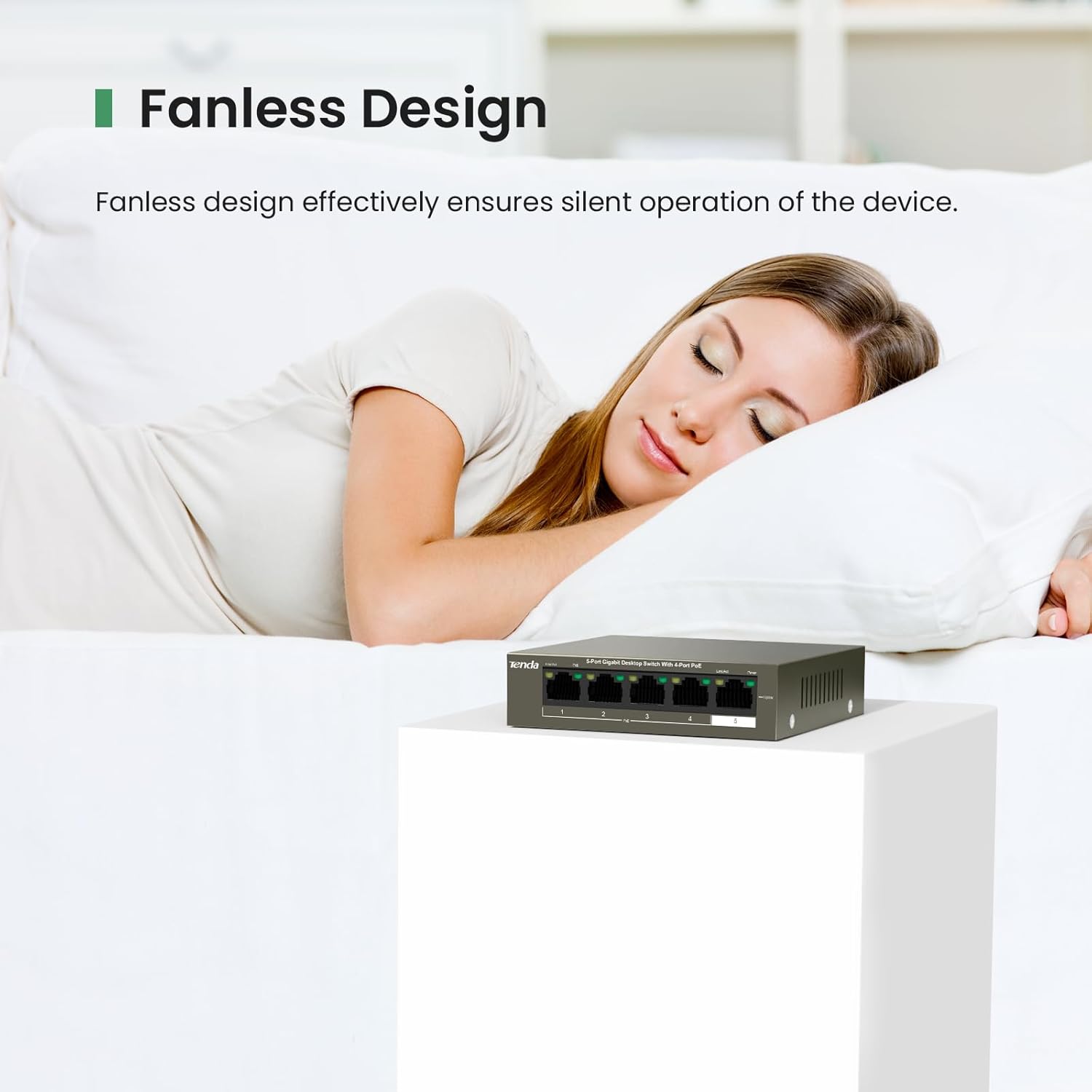 Tenda TEG1105P, 5 Port Gigabit PoE Switch Compatible with IEEE 802.3af/at Devices, Unmanaged PoE Switch with 4 Port PoE+@63W, Plug & Play, Fanless & Metal Design, Limited Lifetime Protection