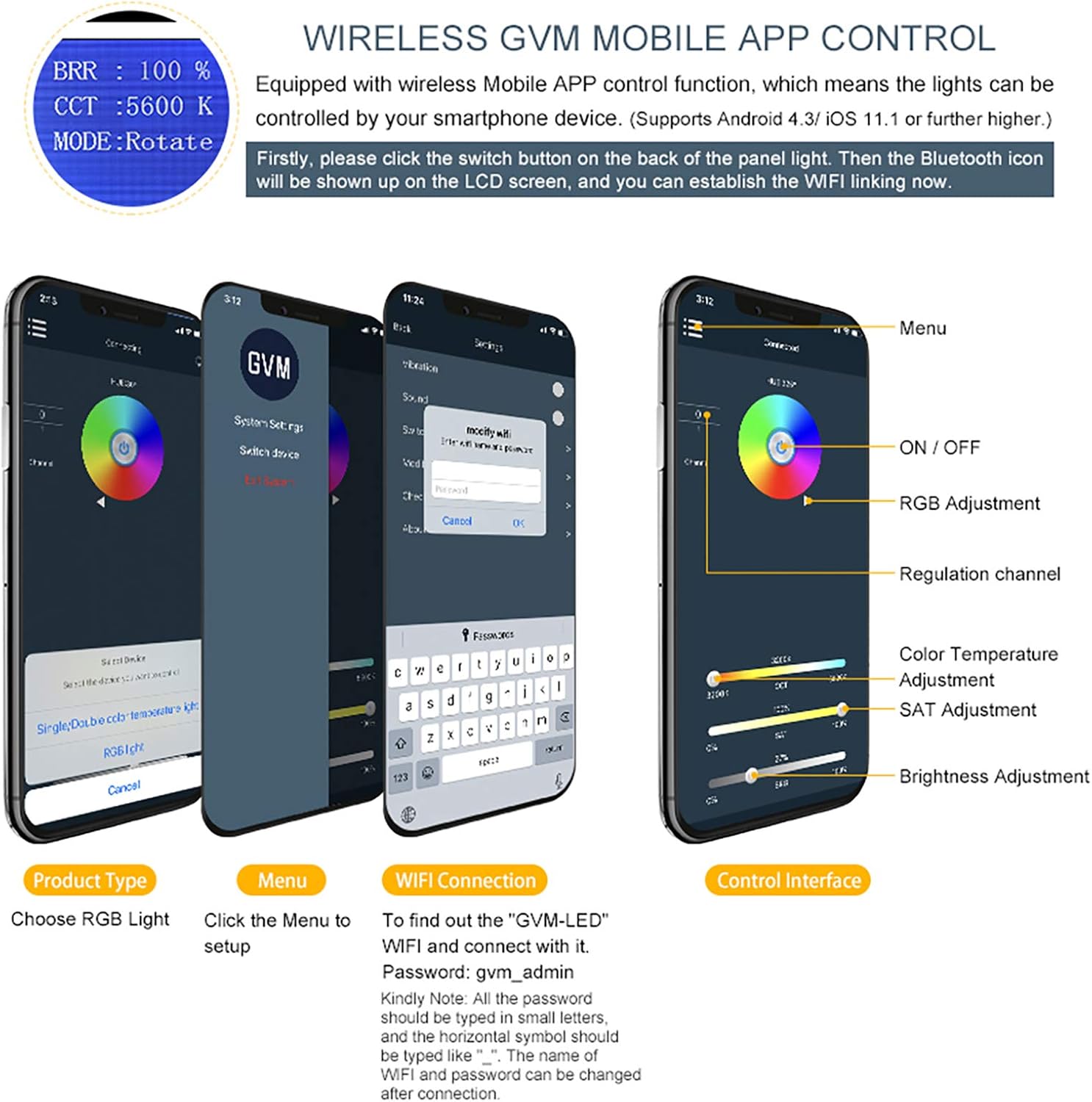 - APP/Master-Slave Control System:Download the app "GVM" on your mobile phone, you can easily control any video lighting. It also has wireless Master-Slave Control function. Each LED Panel could be set as the master video light to control the same series LED video lights.