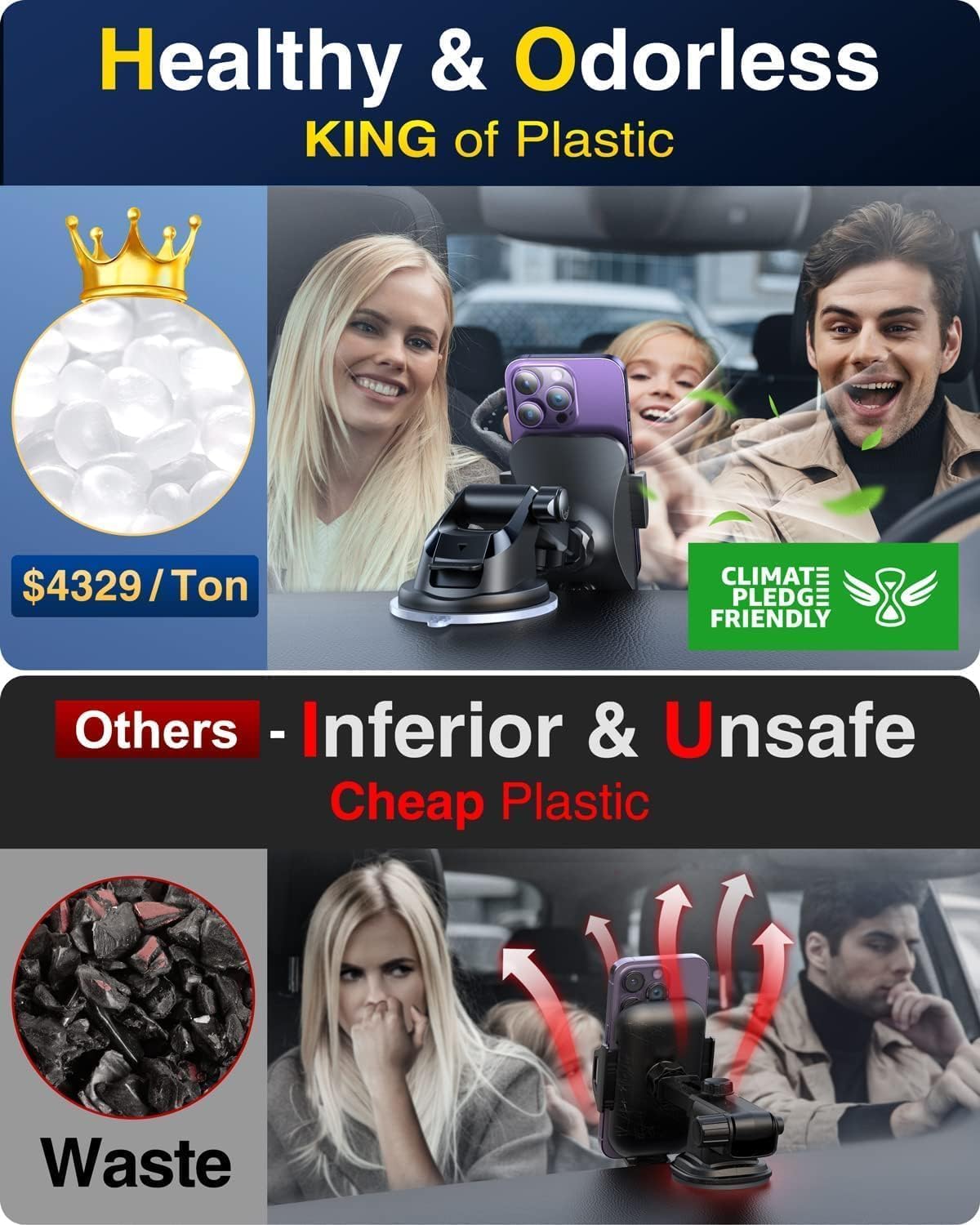 - 【High Grade = Quality Materials + Patented Design】2024 Ultimate Model made of PC+ABS material has passed 4 environmental reliability tests and has a temperature resistance range of -44℉ to 194℉, it is also highly resistant to UV rays (Ensuring reliability even in the sun), and the telescopic pole uses a reinforced sliding rail structure to greatly reduce wobbling during driving. This suction phone cradle obtained CP65 & RoHS safety certifications and patent No.006590790-0003