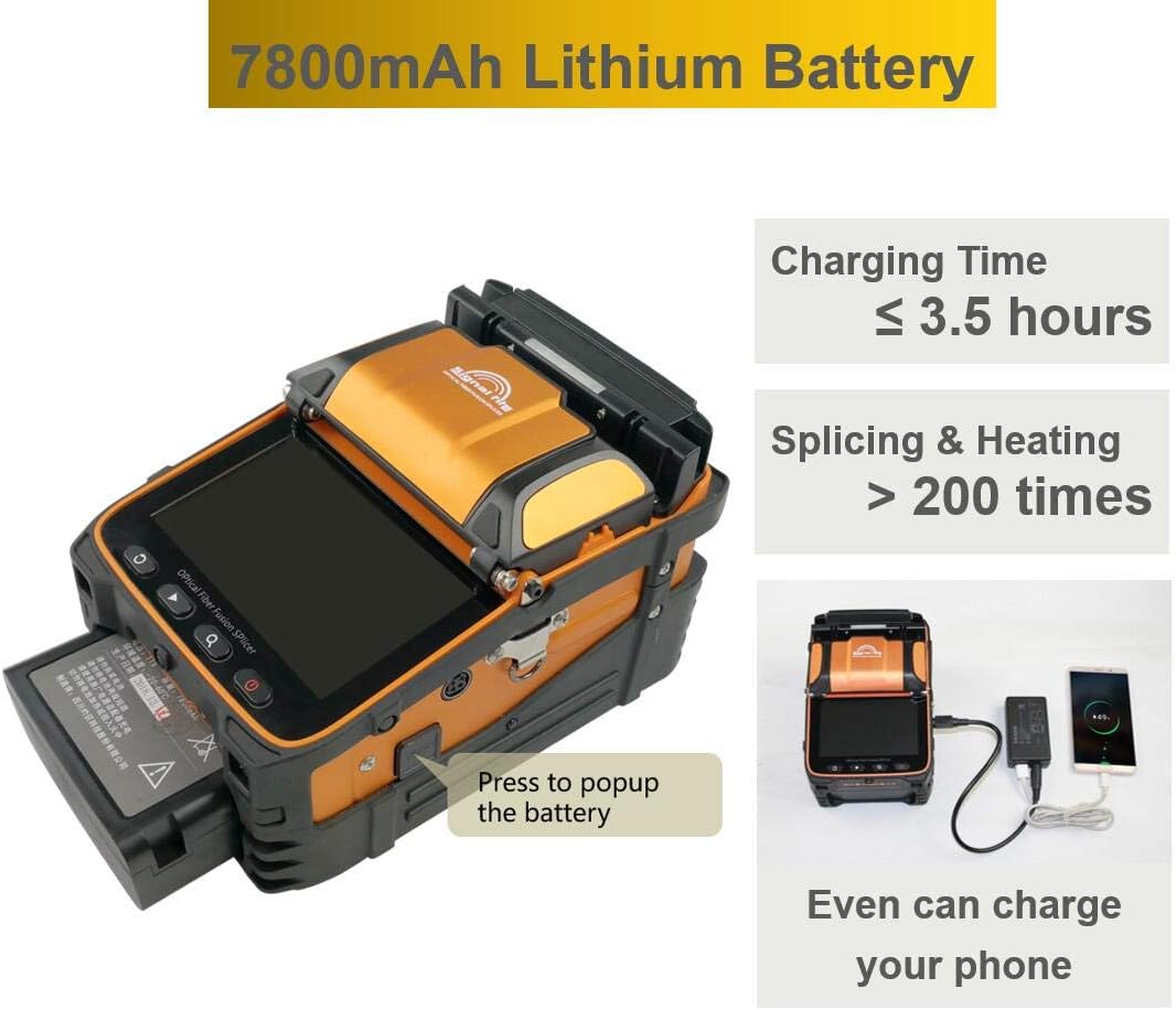 - High-end Fiber Optic Fusion Splicer Kit-- Core alignment technology with auto focus and 6 motors, Industrial quad-core CPU, 10 languages available for switching, 7800mAh large capacity battery