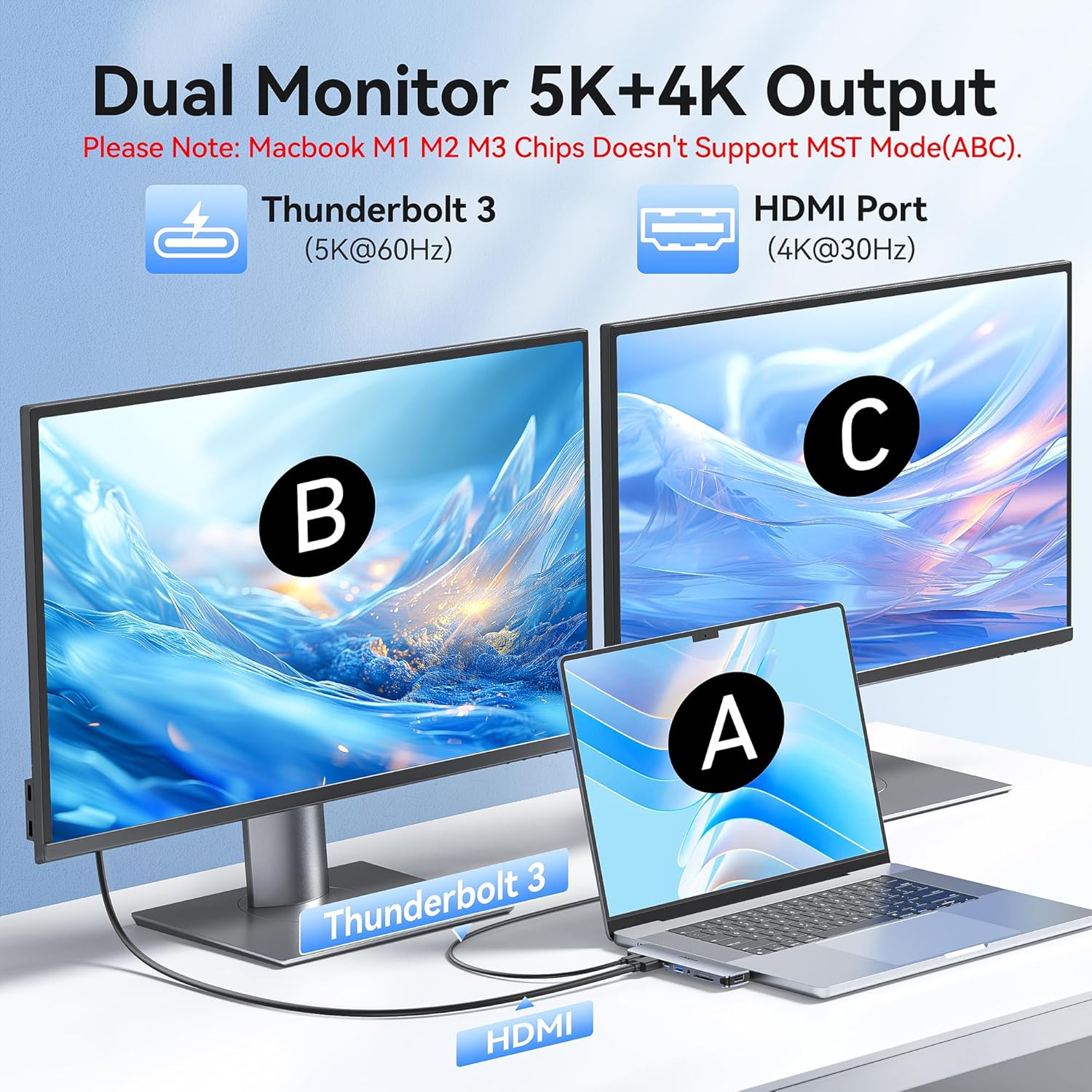 - 【Dual USB C Female Port】The first usb c port is a original thunderbolt 3 port like the macbook itself which support data transfer up to 40Gb/s, up to 5K display and up to 100W power; Another usbc port is a data transfer port which speed can up to 5Gbps, a best port for USB C Device like ssd hdd,etc. Notice: The second usb c port of this usb c hub doesn't support HDMI output and charging function.