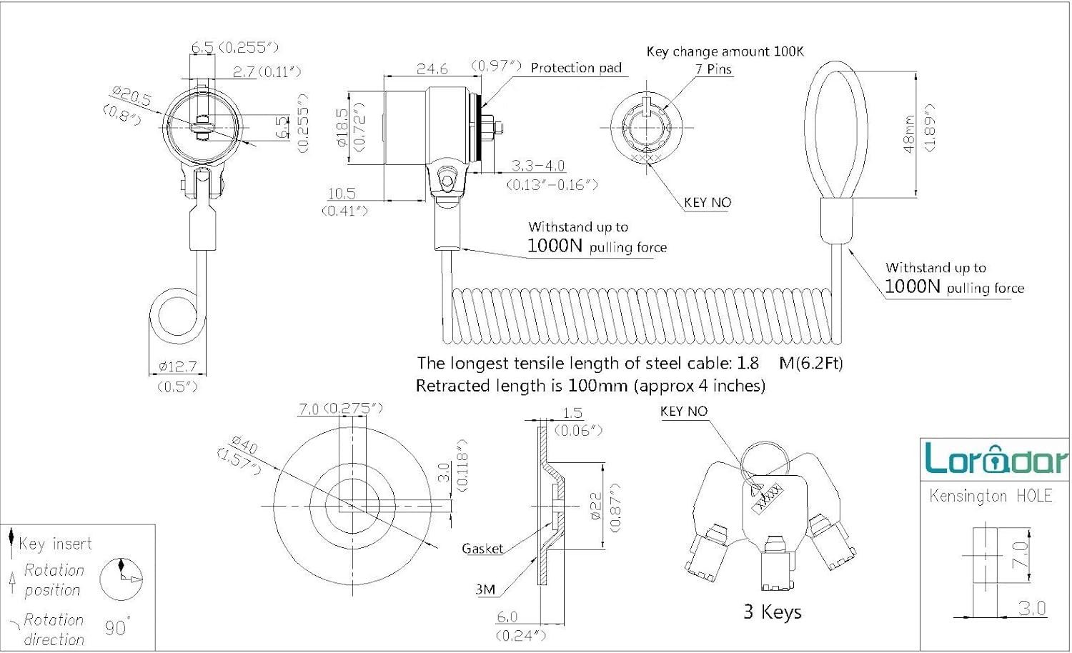 - 【Self-rolling cable】 The maximum stretching length can reach 1800mm (6ft). The minimum rebound size is 100mm (4in). Anchor plate with strong adhesive, please wipe the sticking area clean before use, static pressure for 3-5 minutes, maximum pressure of 60lb after 48 hours The cable connector can withstand the maximum 1100N tensile test. This lock is exquisite and compact, with military quality, easy to carry and save space