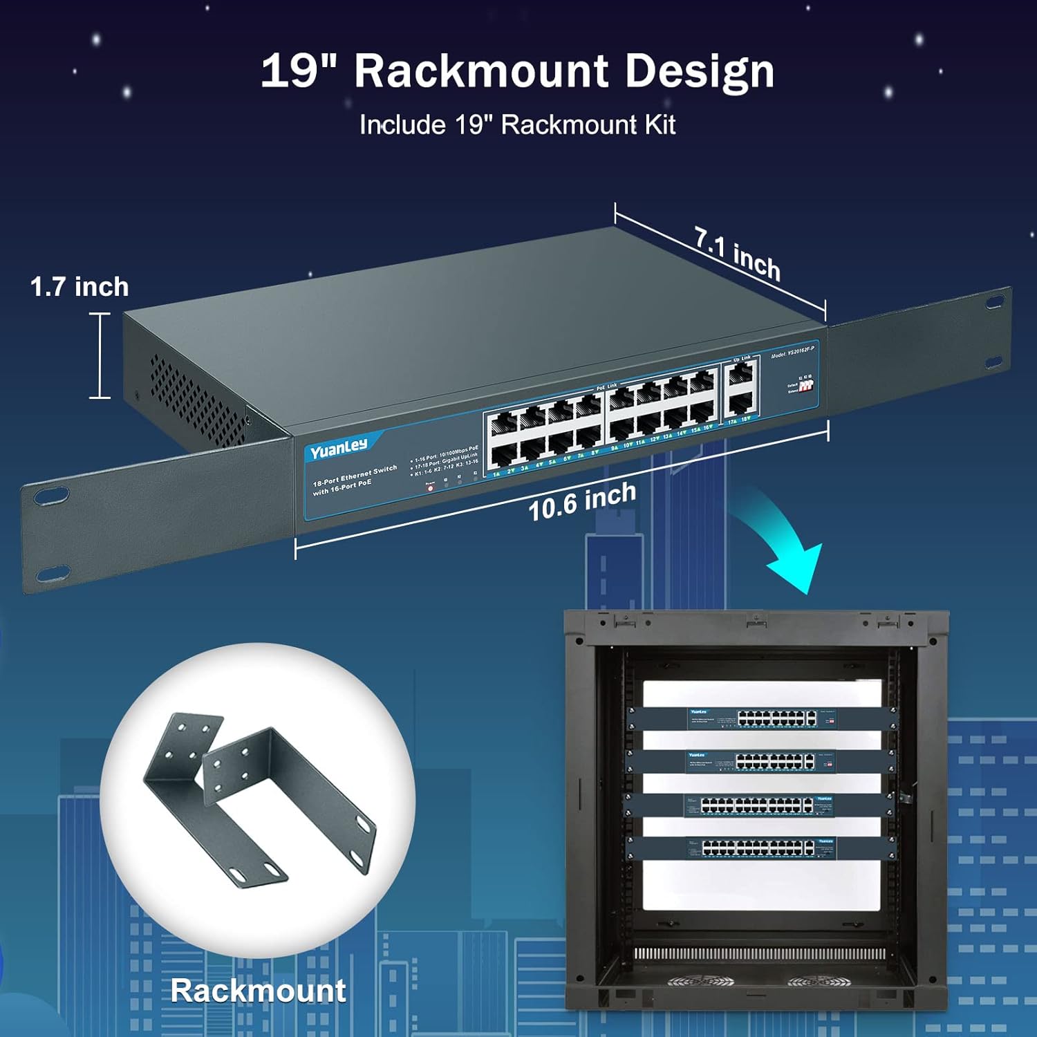 - [PoE Switch with 16 PoE+ Ports] - YuanLey 18-port ethernet PoE switch contains 16 PoE/PoE+ ports(10/100Mbps) and 2 Gigabit Uplink (1000Mbps) that can support bandwidth up to 12Gbps.