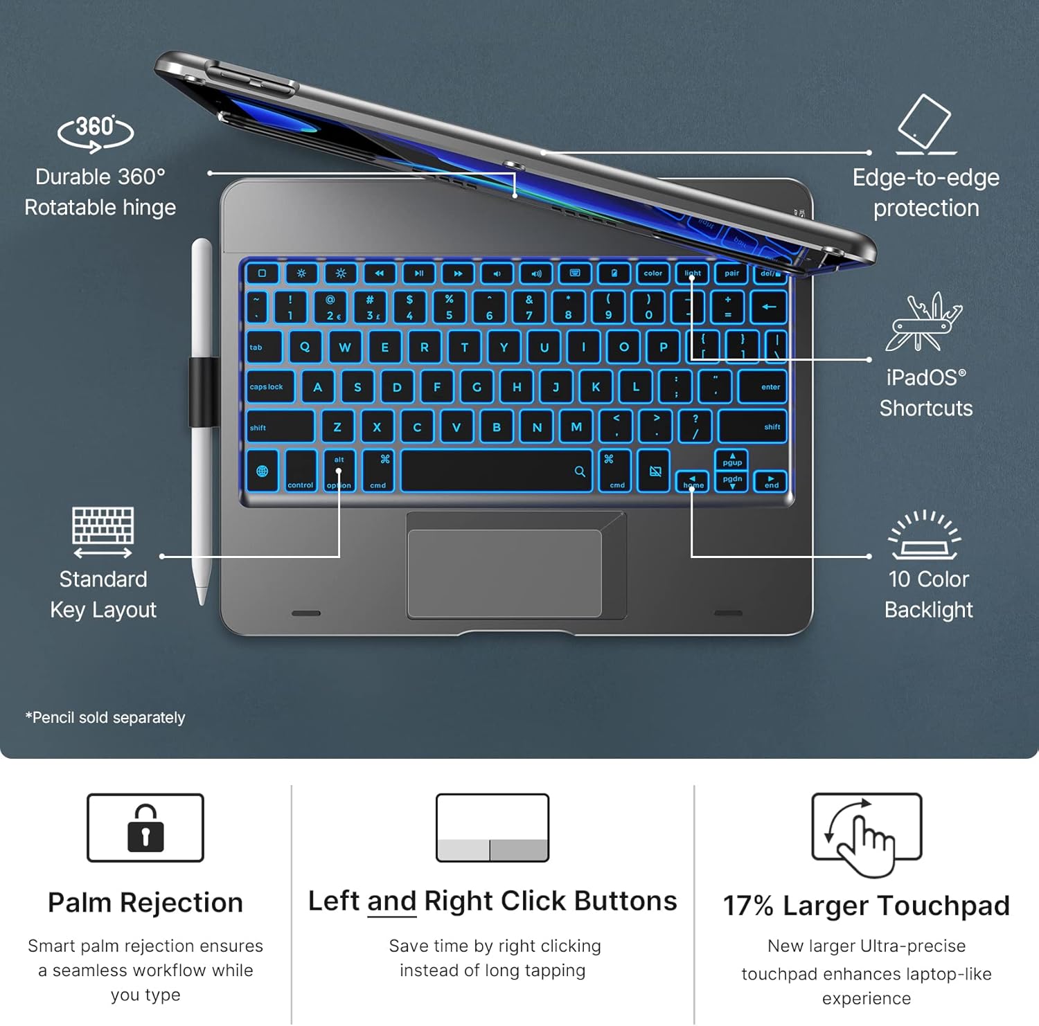 - Style : 360, Rotatable, Trackpad, 10 Colorful Backlight, Pencil Holder