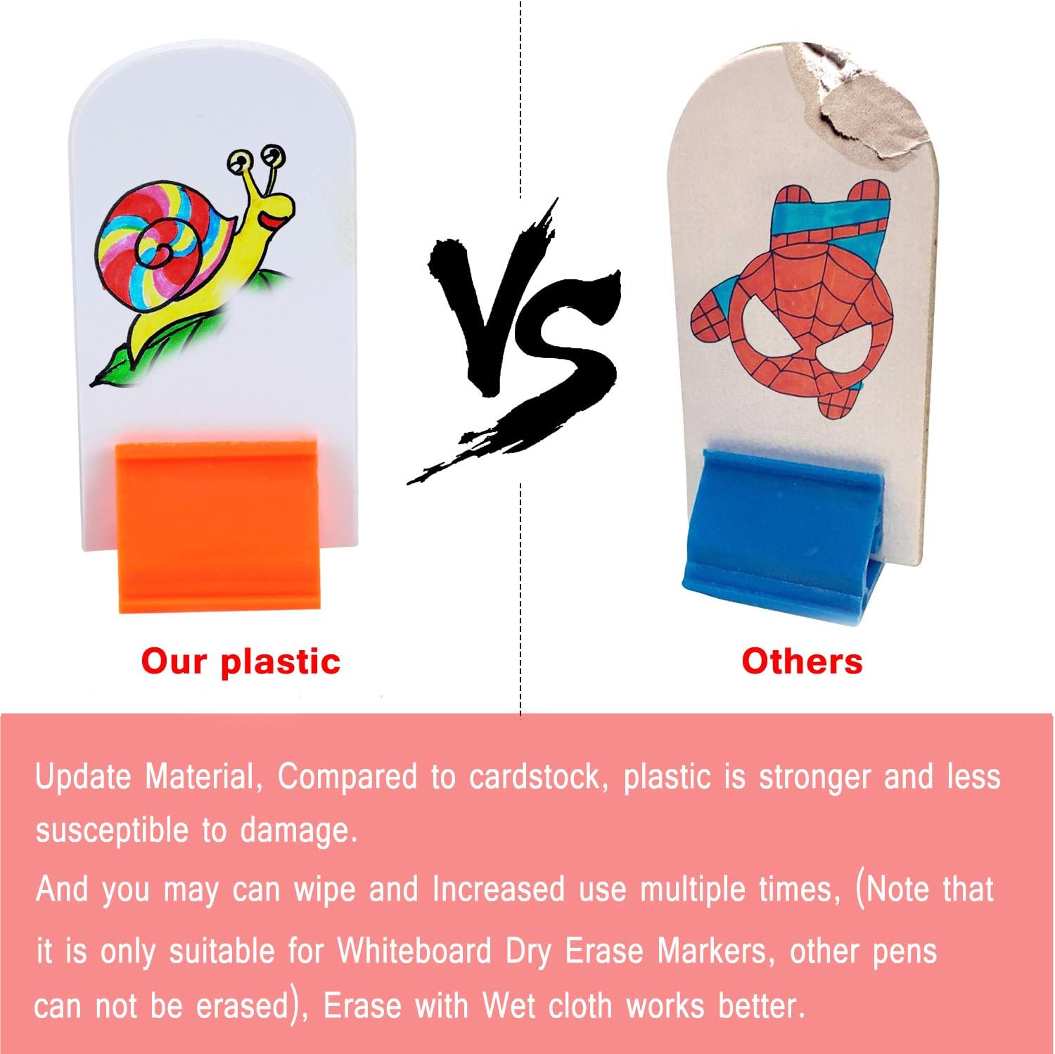 - 【Update Features】: New upgraded material, use the marker to draw on it, you may can wipe and Increased use multiple times, but not permanently complete wiped clean. (Note that it is only suitable for Whiteboard Dry Erase Markers, other pens can not be erased), Erase with Wet cloth works better!!! Note,this is just a better than the cardboard material, but cannot be guaranteed to be wiped clean after each time use
