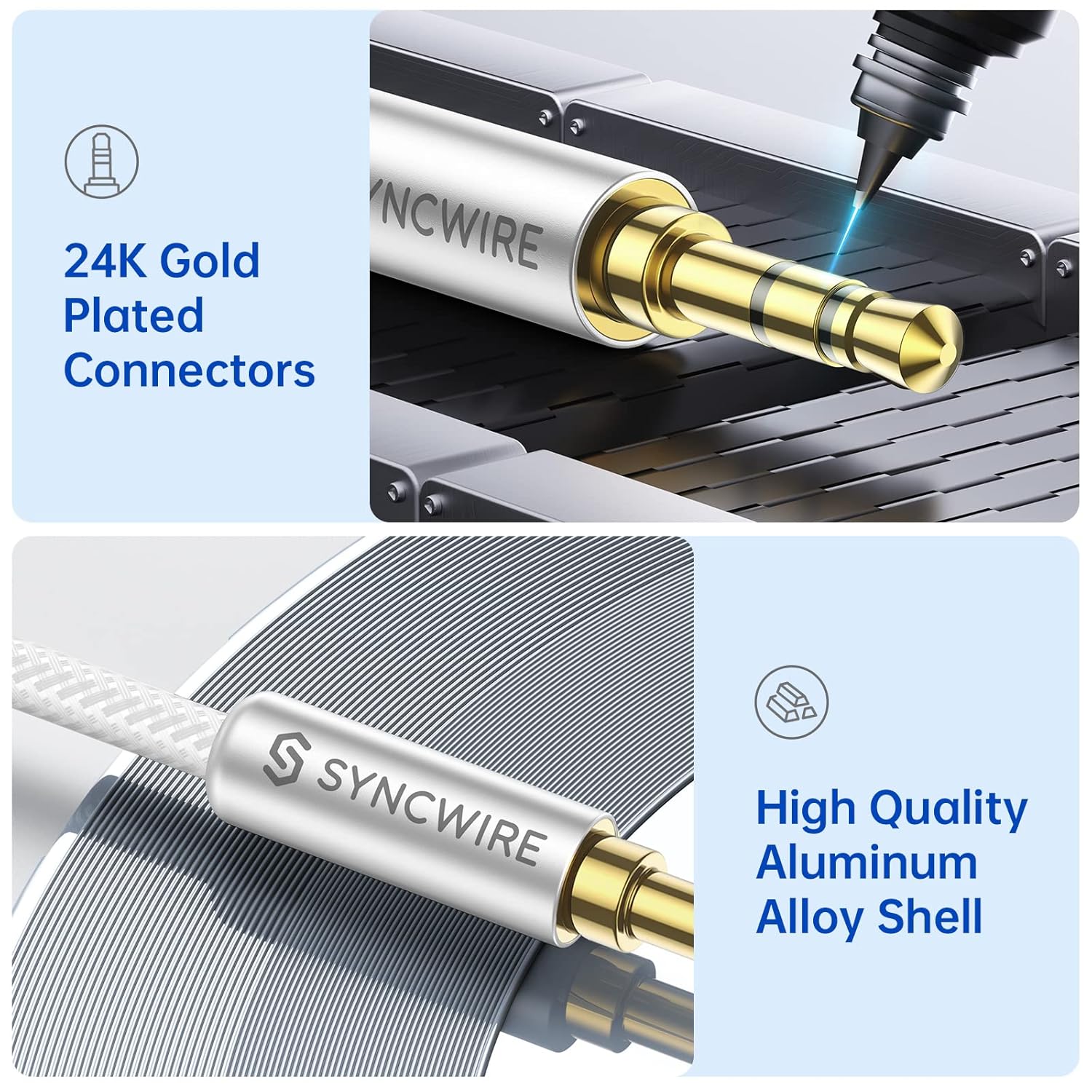 - Precise connection construction: Due to the precise connection technology, it is almost impossible to experience connection problems with the Syncwire Aux audio cable. No more annoying buzzing or losing contact.