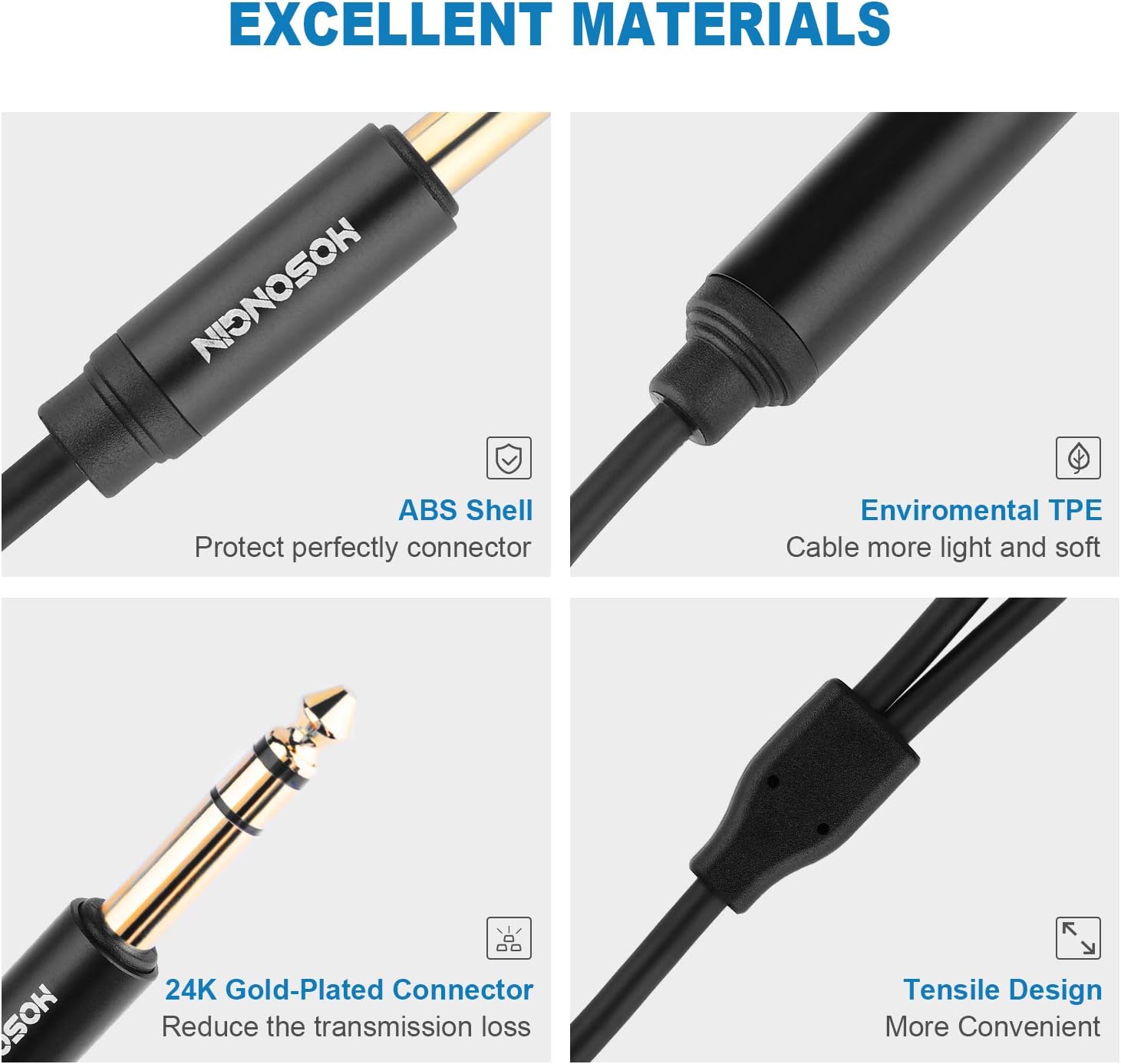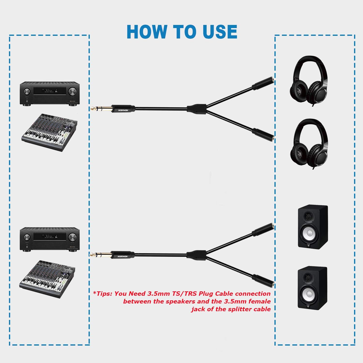 - 🎧 Connect Your Audio Devices with Ease: The HOSONGIN 1/4" TRS to Dual 3.5mm Splitter Cable bridges your professional audio equipment to standard headphones or speakers. Perfect for mixers, amplifiers, and instruments that need to output high-quality stereo sound to dual 3.5mm devices.