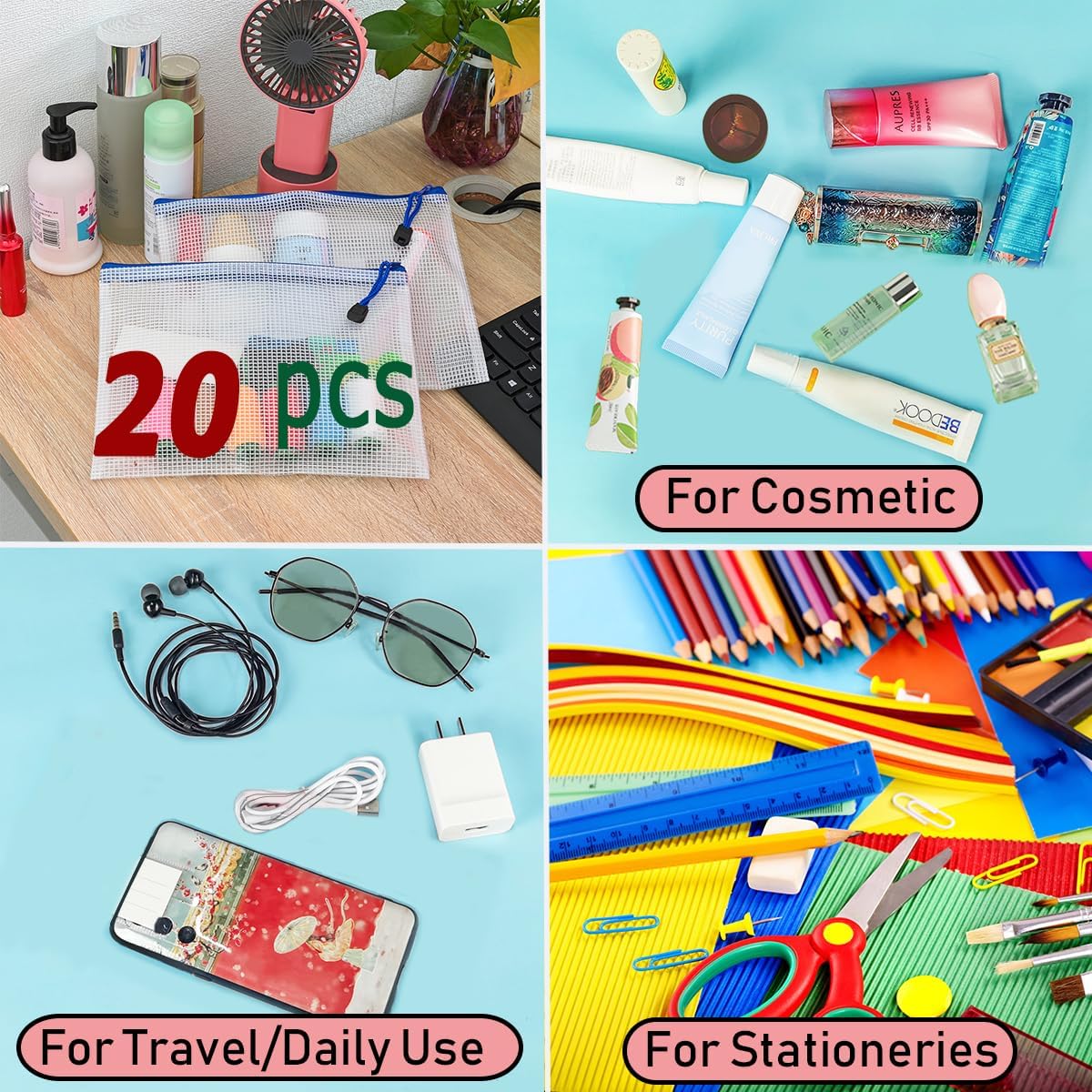 AUSTARK 20 Pcs Zipper File Bags, Plastic Mesh Pouch, Board Game Storage Bag, Waterproof Bags for Office School (A5 Size 9.2''x6.7'', White and Blue)