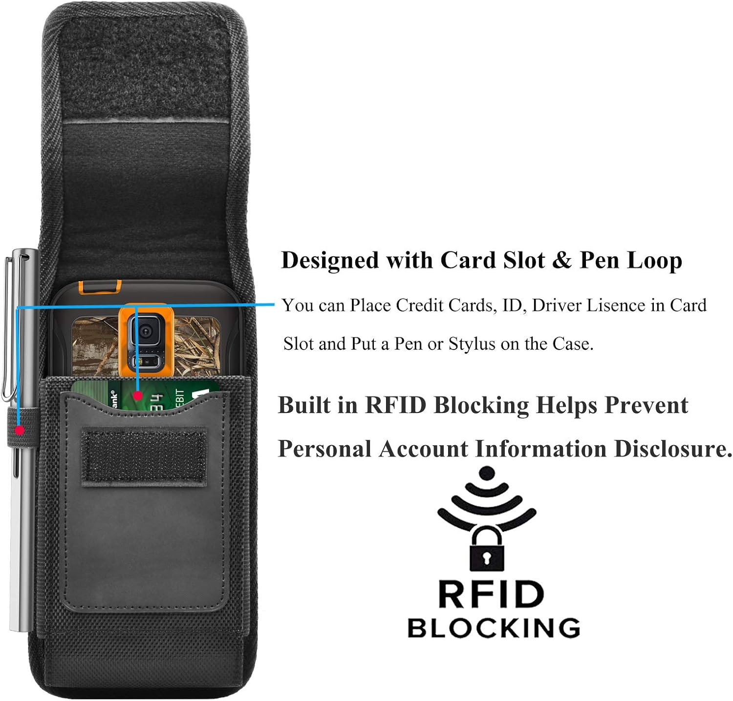 - ✦Practical Design with Card Slot & Pen Loop: the holster designed with card slot to place credit cards, ID, Driver Lisence, lovers or child's photo. There is also an elastic-type wide band to hold a pen or stylus on the case.