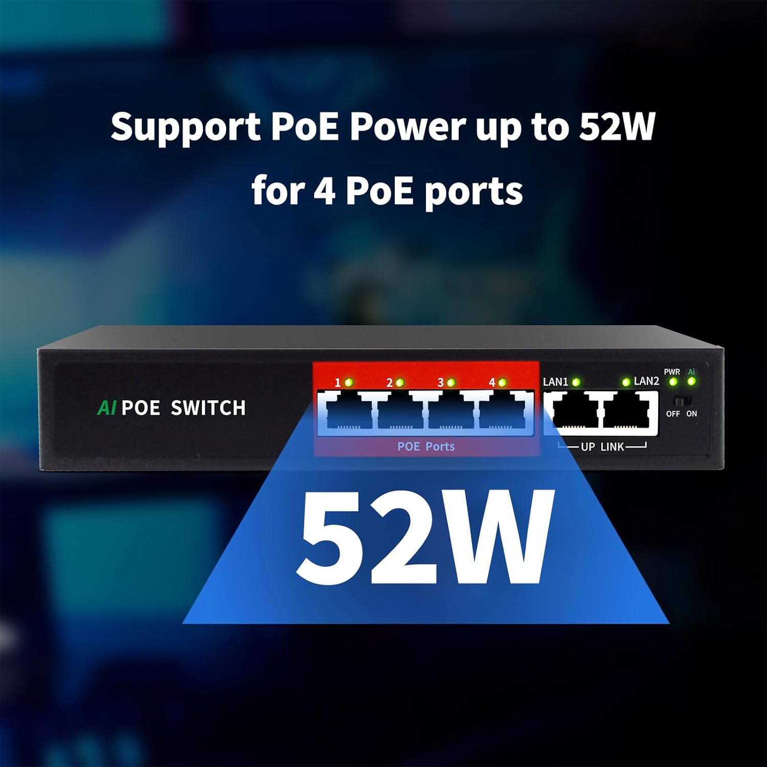 - 【4 port poe switch*100M@52W 】PoE switch with 4 port PoE + 2 Uplink port,4× PoE ports providing up to 30W per port, total PoE budget 52W,2 port uplink ideal for connecting NVR and Internet , etc.