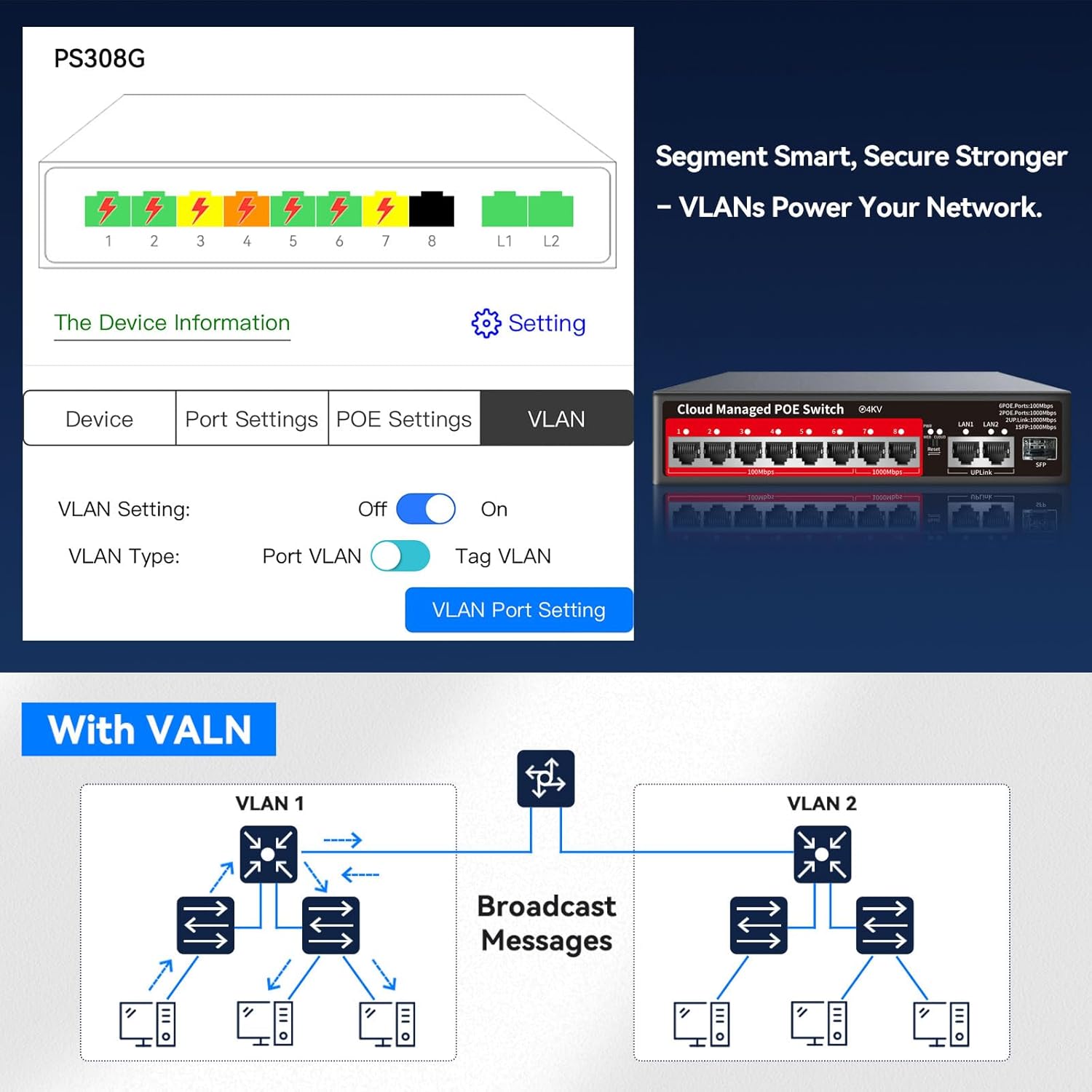 - 8-port managed Power over ethernet switch