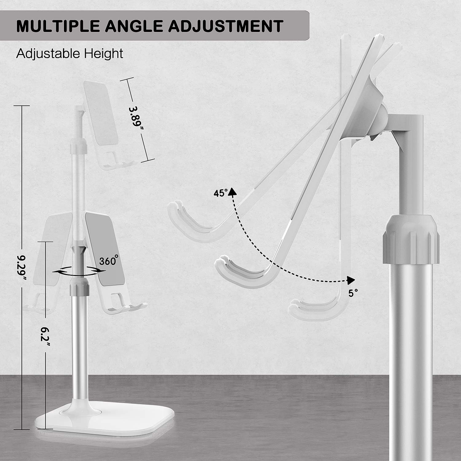 - ADJUSTABLE:This cell phone stand can be easily adjusted to the (0°~ 45°) angle by hand, and it stays firmly in place.The height can be easily adjusted