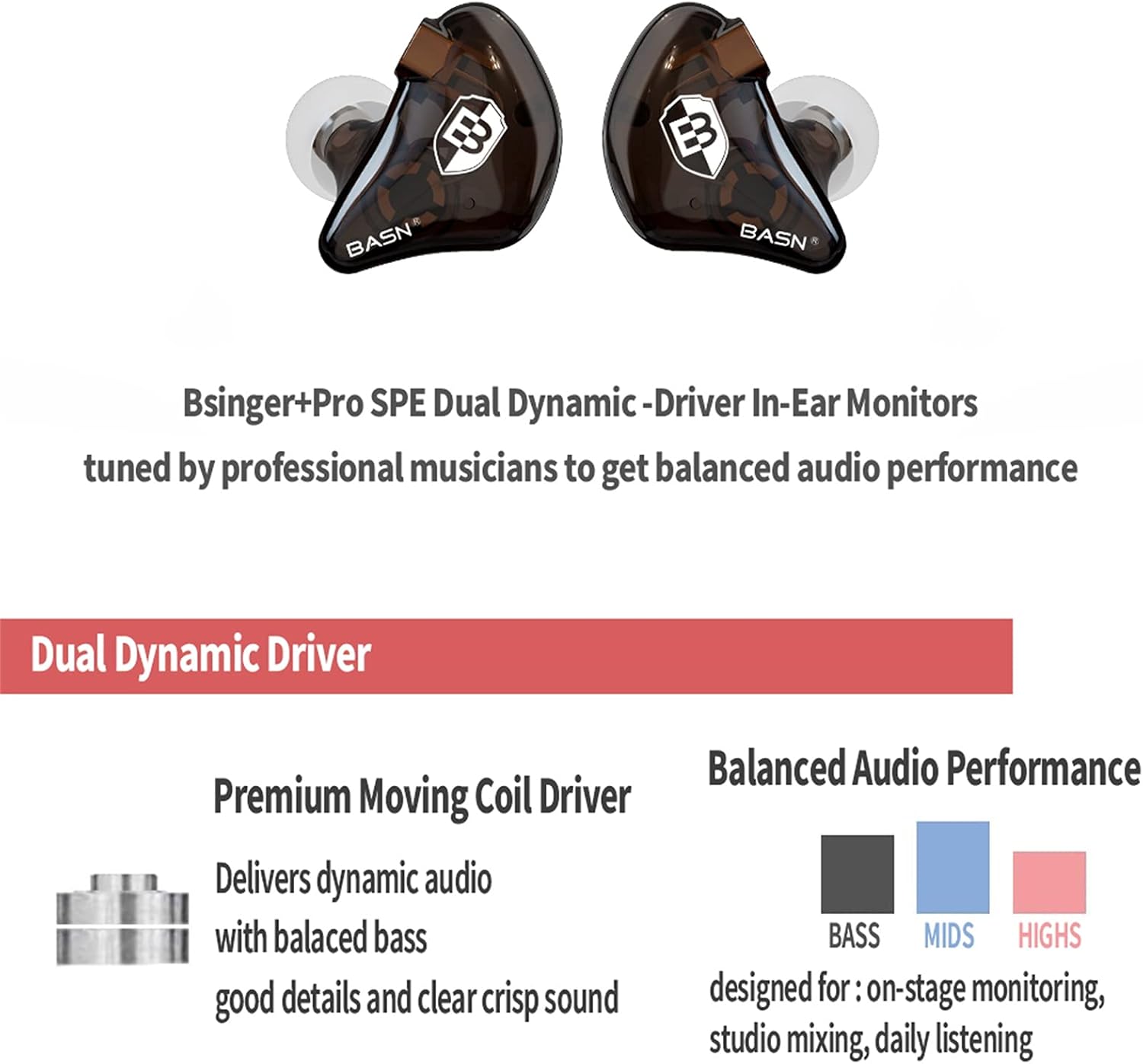 BASN Bsinger in Ear Monitor Headphones for Musician, Dual Dynamic Drivers Noise Isolating Earbuds with MMCX Inline Remote Mic Cable and Silver Plated Audio Cable (SPM-Brown)