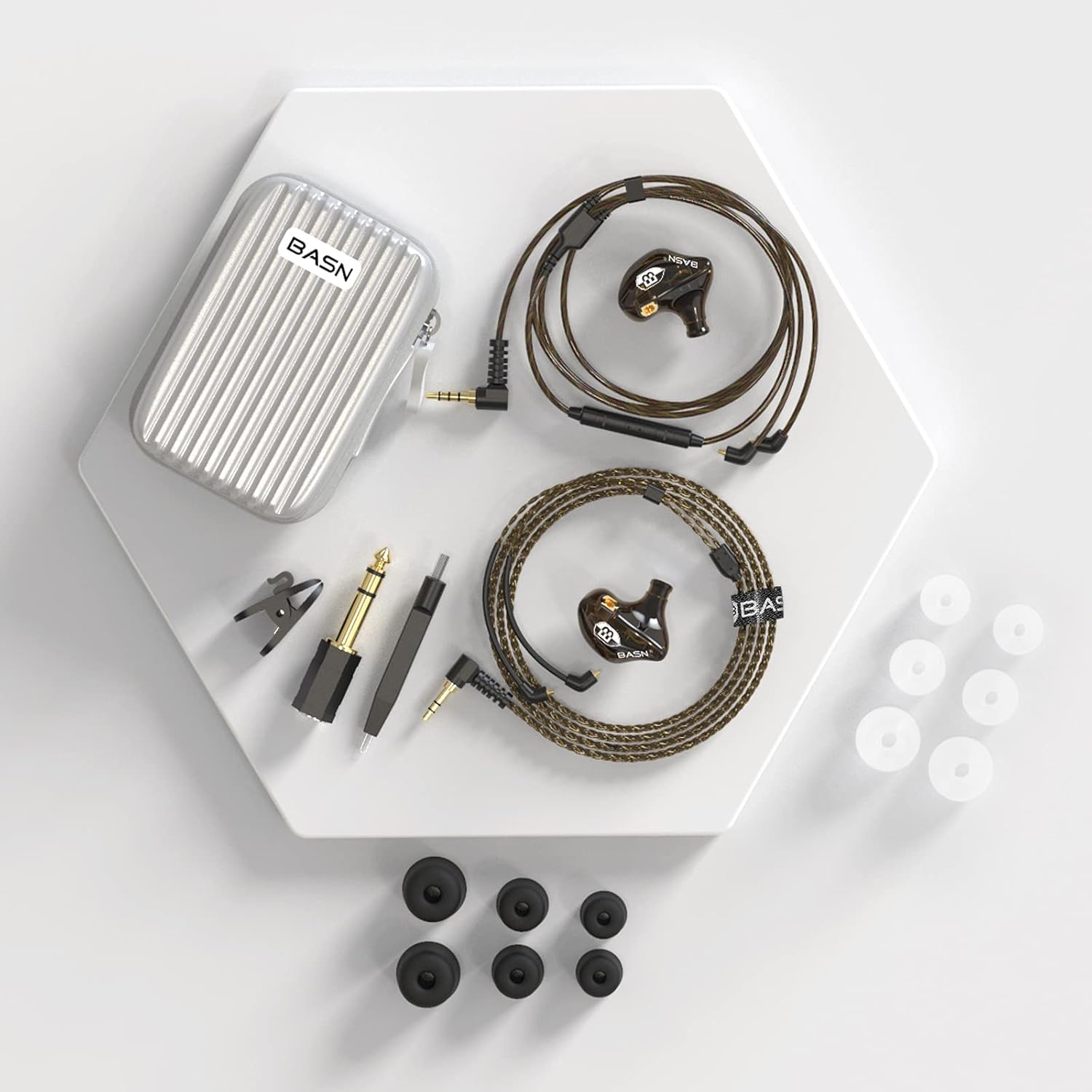 - Build Quality & Comfort - The BASN in-ear monitor headphones for musician well-assembled housing is smooth and glossy, it feels also solid and no crackling noise when you try to squeeze them; As for the comfort, after a long music listening session (3-4 hours), had no ear fatigue at all
