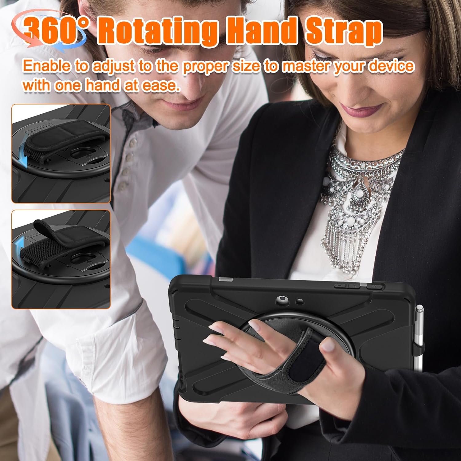 - ๐๐จ๐๐ญ ๐๐๐ง๐ ๐๐ญ๐ซ๐๐ฉ & ๐๐จ๐ซ๐ญ๐๐๐ฅ๐ ๐๐ก๐จ๐ฎ๐ฅ๐๐๐ซ ๐๐ญ๐ซ๐๐ฉ & ๐๐จ๐ญ๐๐ญ๐ข๐ง๐ ๐๐ญ๐๐ง๐: โ Connected with 360ยฐ turntable built-in kickstand, you can adjust your Surface go tablet for watching videos and chatting.โก Adjustable hand strap is perfect for kids and adults to use during work, study or journey, ideal for students ,teachers, engineers, cashiers and waiters, etc โขAdjustable and detachable shoulder belt is very convenience and safe.