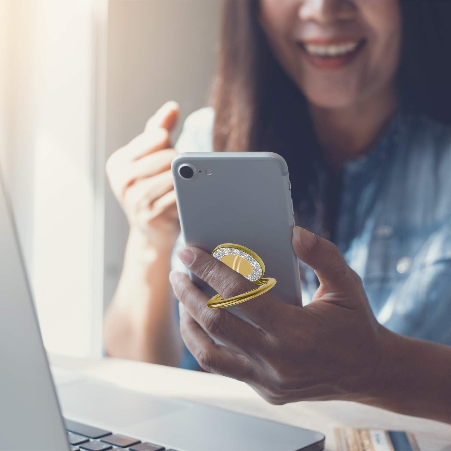 - Constructed with durable zinc alloy and sturdy stainless steel, this glitter phone ring boasts carefully polished edges for both finger protection and enhanced longevity.