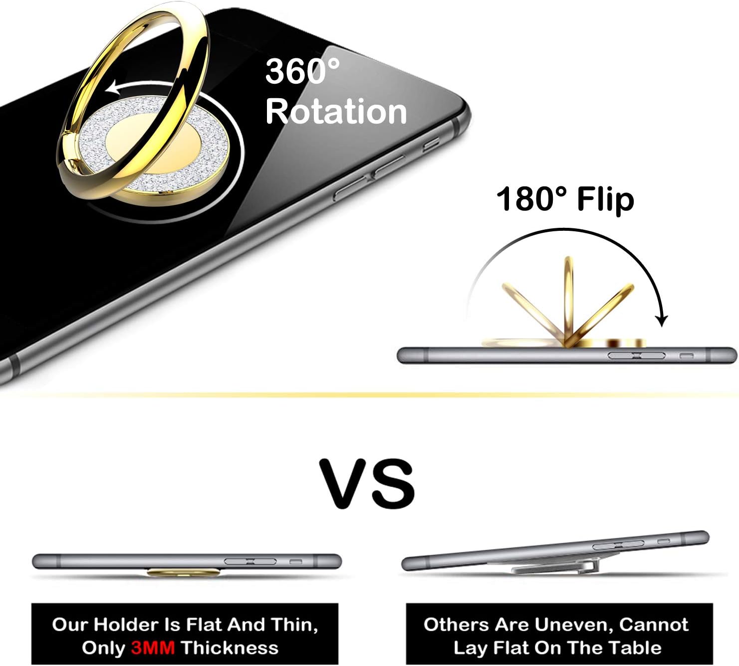 - Boasting an adjustable support angle, Pikabo Glitter phone ring holder ensures flexibility, as it can be conveniently rotated 360° and folded 180°, granting you the ability to find the best angle for your phone placement with ease.