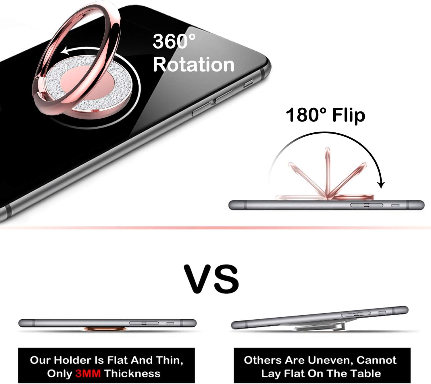 - Boasting an adjustable support angle, Pikabo Glitter phone ring holder ensures flexibility, as it can be conveniently rotated 360° and folded 180°, granting you the ability to find the best angle for your phone placement with ease.