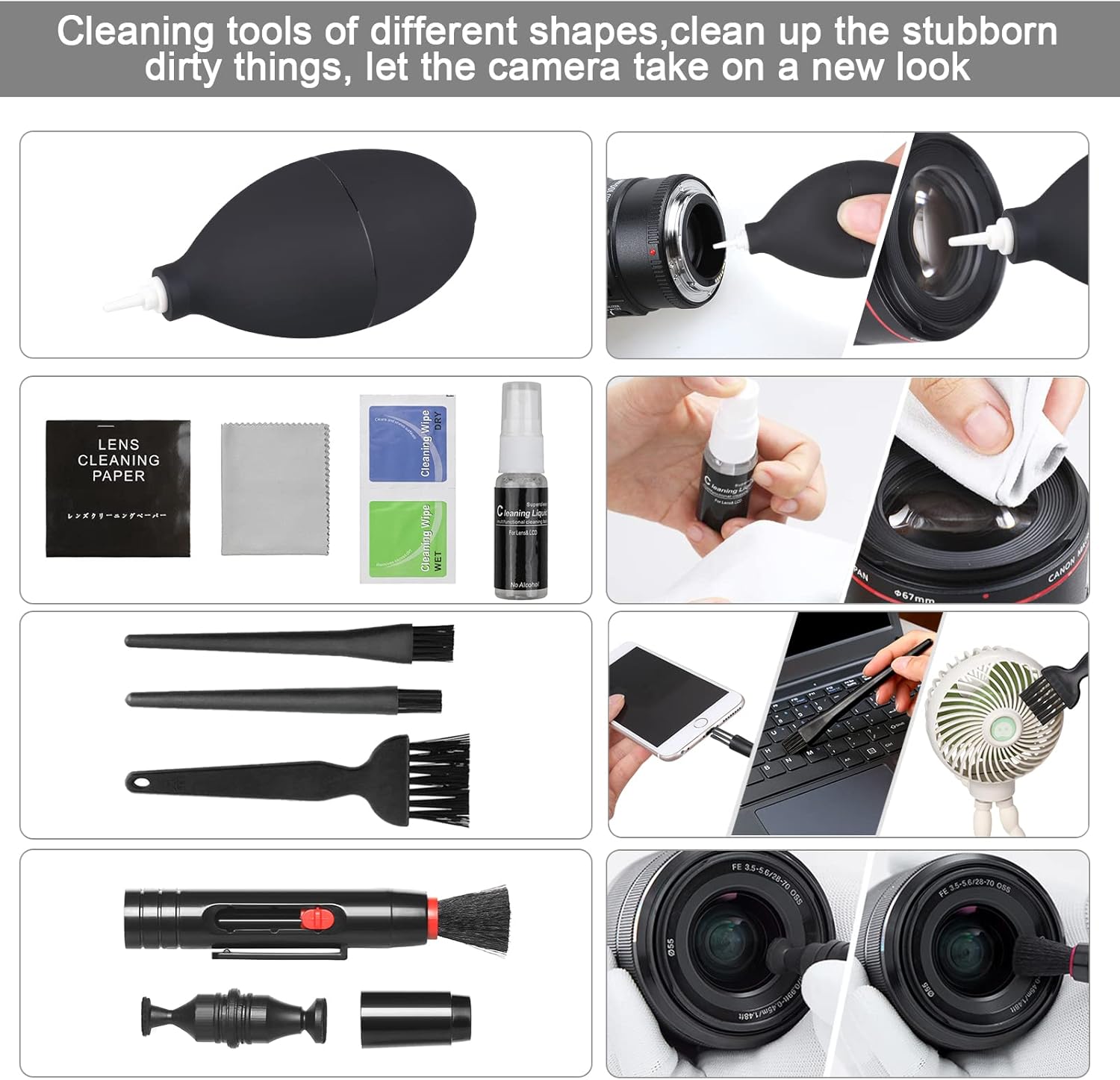 - Widely Used: Our cleanning suit can not only clean the grease, fingerprints and dirt on the camera, camera lens, camera lens and other optical lenses very efficiently. It can also clean other electronic devices, such as computers, laptops, keyboards, mobile phones, Bluetooth headsets, USB ports, shavers, smart watches, etc