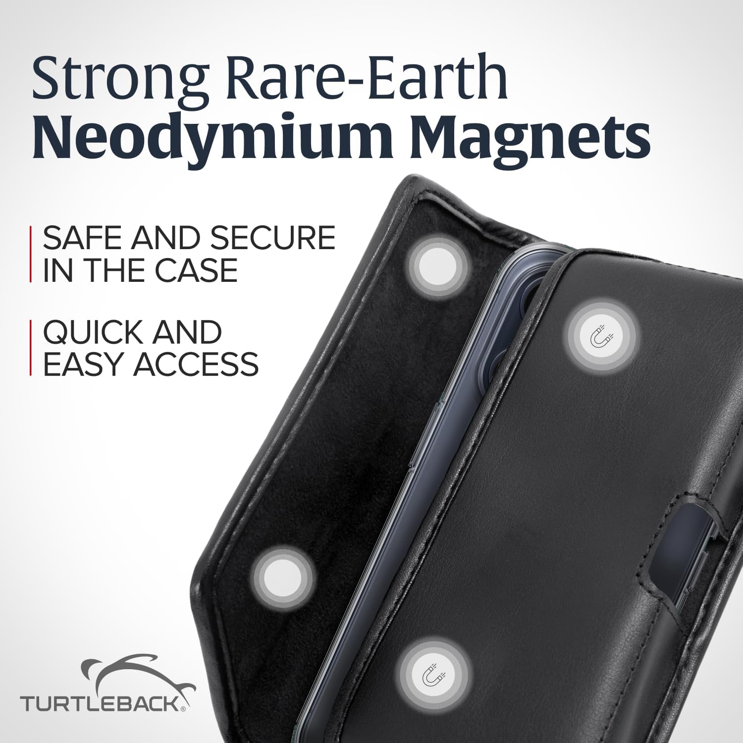 Turtleback Belt Holder for iPhone 16 Pro, 16e, 15 pro 14 Pro 13 Pro -Small- Fits w/Slim MagSafe Style Cases, Premium Black Leather Horiz. Belt Holster, Magnetic Closure, Leather Wrapped Belt Clip