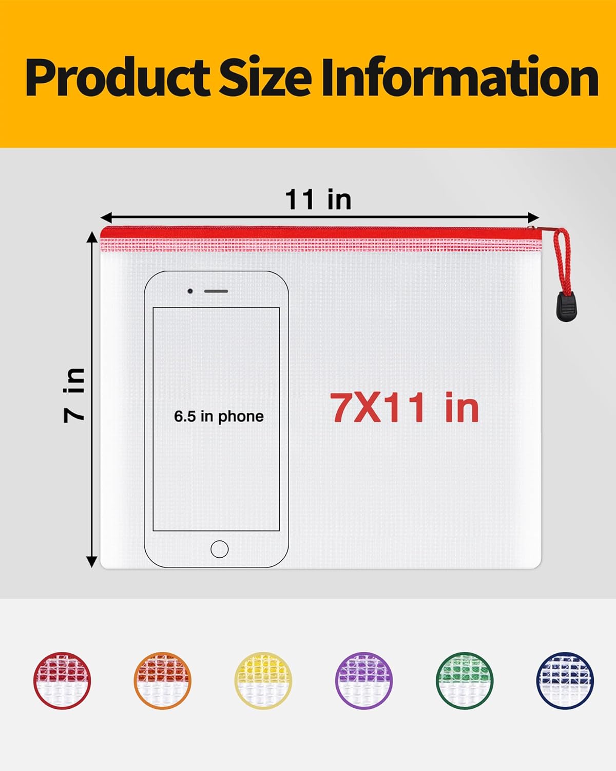 - PACKAGE CONTAINS: You will get a set of 12 Packs 7x11 inches multi-colored plastic zipper pouches for the most paper size of letter-size prints or smaller document storage. It can help you organize your miscellaneous items to meet your daily life and work. Manufacturer recommended age 3 years and up