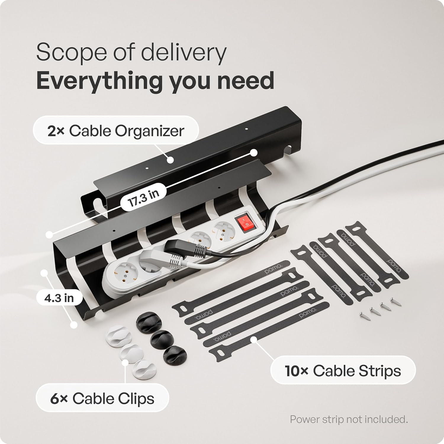 - ADDITIONAL CLIP CABLE TIES - Included with our premium desk cable organizer are 6x reusable cable ties to bundle your cable sets. Perfect accessory for the pamo cable rack. Dimensions cable organiser: 2pcs. each 44x10x12cm