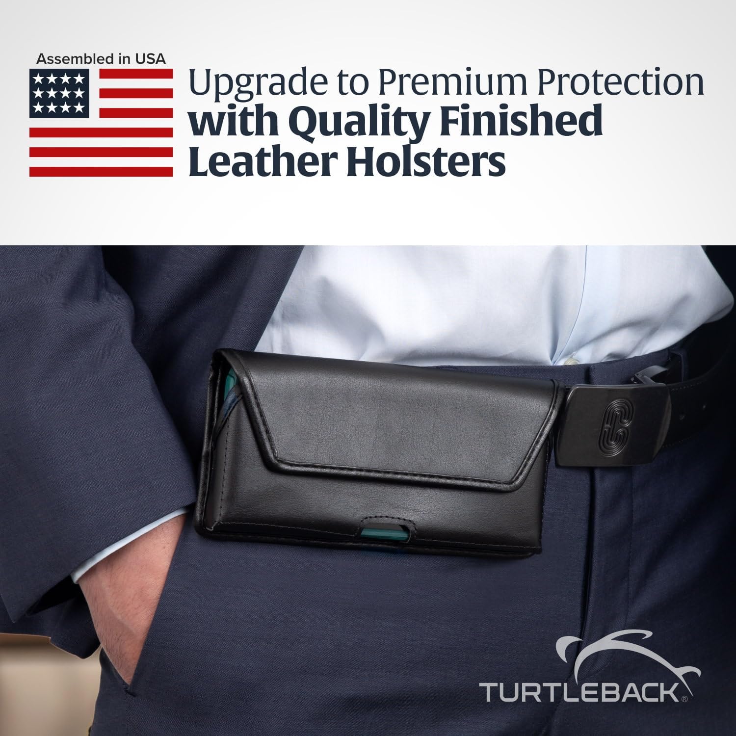 - DESIGNED AND BUILT IN THE USA: The Turtleback leather phone case is crafted from premium imported leather, offering a sleek look and durable feel that complements any style. This phone holster fits horizontally on your belt and features a secure, leather-wrapped metal clip for reliable everyday carry. Whether you need a rugged iPhone belt holder for men or a stylish holster for work, we have you covered. Turtleback has been proudly designing and building cases in the USA since 2001.