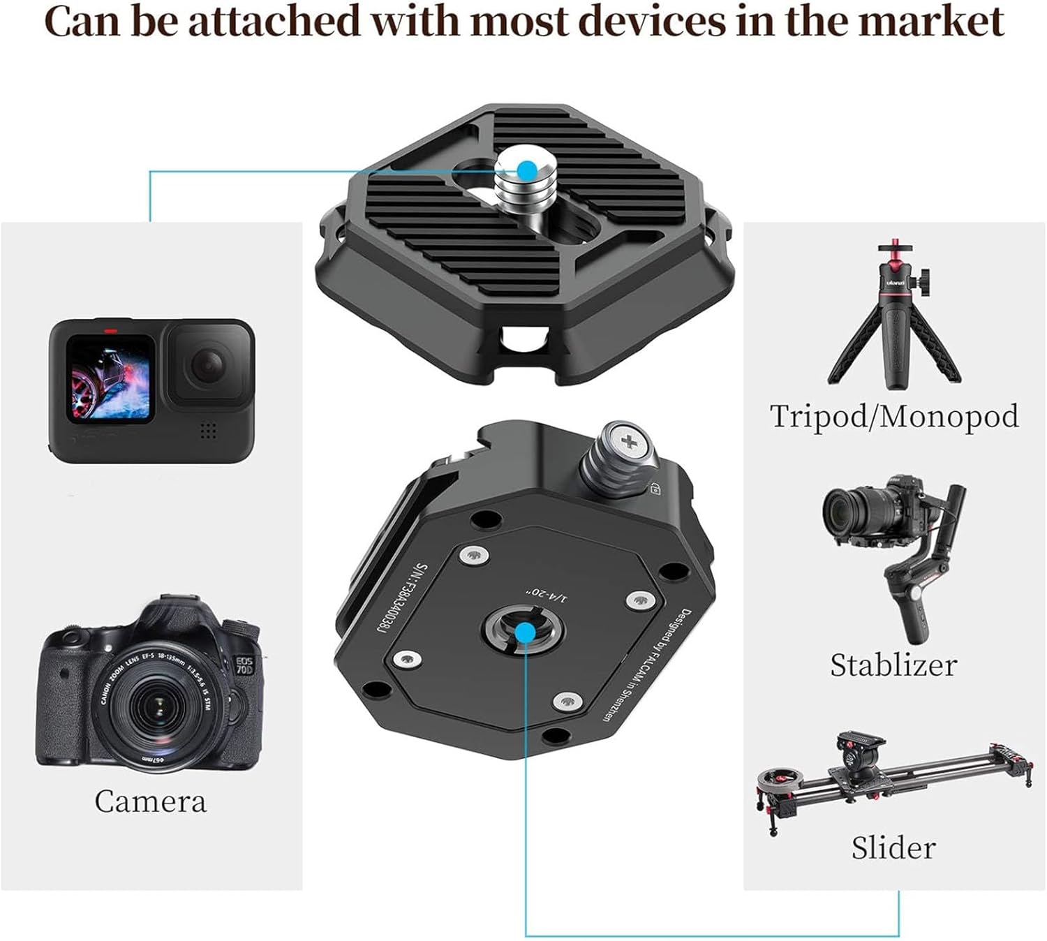 - Widely Compatible: 1/4" and 3/8" 2-in-1 screw hole on base mount is compatible with tripod, stabilizers, gimbal, video monitor, monopod; 1/4 screw thread on top plate fits any cameras like sonny ZV-1, SLR, phone mount, Action Camera adapter ect